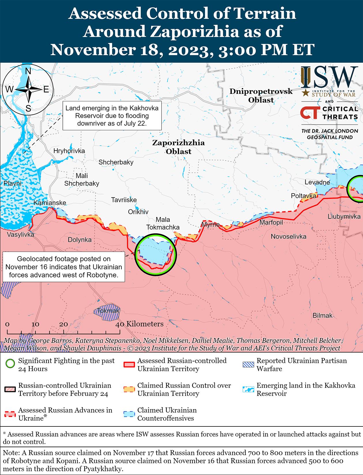 18 ноября российские войска перешли в контрнаступление на западе Запорожской области, но не добились каких-либо подтвержденных успехов. Украинский Генштаб сообщил, что российские войска безуспешно атаковали вблизи Роботино и Новопрокоповки и западнее Вербового. [54] Известный российский блогер утверждал, что российские войска безуспешно контратаковали западнее Роботина и со стороны Вербовое. [55] Российский военный блогер утверждал, что подразделения 291-го мотострелкового полка (42-я мотострелковая дивизия, 58-я общевойсковая армия, Южный военный округ) успешно контратаковали вдоль линии Копани-Роботино (до 6 км к северо-западу от Роботино) и 17 ноября отбили неустановленные позиции. [56] Другой российский источник утверждал, что российские войска продвинулись на 700-800 метров в результате успешных контратак вдоль линии Копани-Роботине, но ISW не наблюдал визуального подтверждения этого заявления. [57]