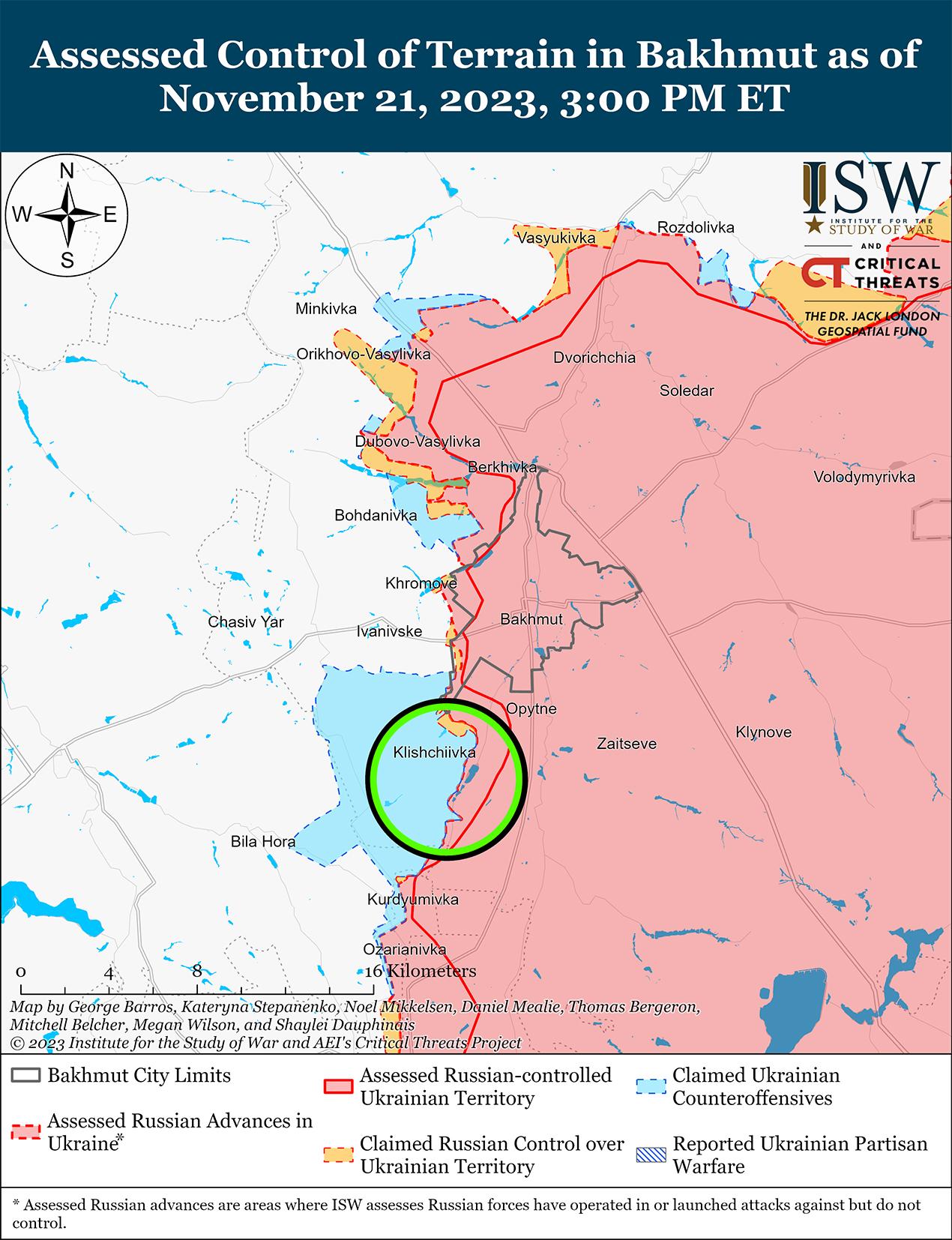 21 ноября российские войска продолжили наступательные действия в районе Бахмута и, как сообщается, недавно продвинулись вперед. Российский новостной агрегатор заявил, что 20 ноября российские войска продвинулись в районе Берховского водохранилища (к северу от Бахмута) и в Клещеевке. [52] 21 ноября Генштаб Вооруженных сил Украины сообщил, что украинские силы отразили атаки россиян в районах Клещеевки и Андреевки (10 км к юго-западу от Бахмута). [53] Командующий Сухопутными войсками Украины генерал-полковник Александр Сырский заявил 21 ноября, что российские войска продолжают попытки вытеснить украинские войска с позиций вблизи Клещеевки. [54]