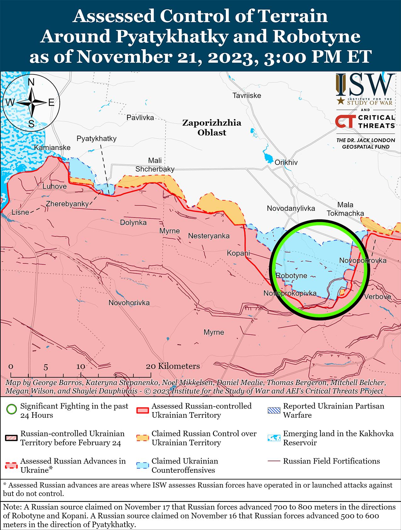Российские войска вели наступательные действия на западе Запорожской области, но 21 ноября не добились подтвержденных успехов. Генштаб Вооруженных сил Украины сообщил, что российские войска безуспешно атаковали вблизи населенных пунктов Роботино и Каменское (36 км к северо-западу от Роботино) и северо-западнее Вербовое. [69] Российские источники утверждали, что российские войска продвинулись в направлении Новофедоровки (15 км к северо-востоку от Роботино) и в районе Роботино, Новопрокоповки и Вербового. [70] 20 ноября российский военный блогер заявил, что подразделения 70-го гвардейского мотострелкового полка (42-я мотострелковая дивизия, 58-я общевойсковая армия, Южный военный округ) отразили украинские атаки в районе Роботино и Новопрокоповки. [71]