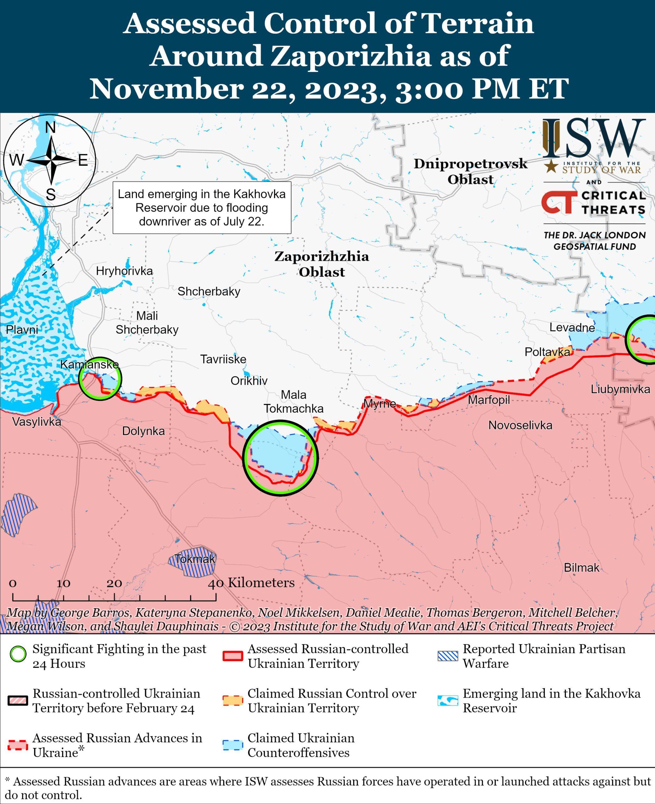 22 ноября российские войска продолжили наступательные действия к западу и юго-западу от Донецка, но не добились каких-либо подтвержденных успехов. Генеральный штаб Вооруженных сил Украины сообщил, что украинские силы отразили более 18 российских атак вблизи Марьинки (непосредственно к юго-западу от Донецка) и Новомихайловки (11 км к юго-западу от Донецка). [73] Российский блогер утверждал, что российские войска продвинулись в районе Марьинки и Новомихайловки, хотя ISW не видел визуальных подтверждений этому заявлению. [74] Спикер украинской бригады Ярослав Чепурный заявил, что за прошедшую неделю российские войска более 150 раз штурмовали украинские позиции на Марьинском направлении и выпустили более 300 ударных беспилотников. [75]