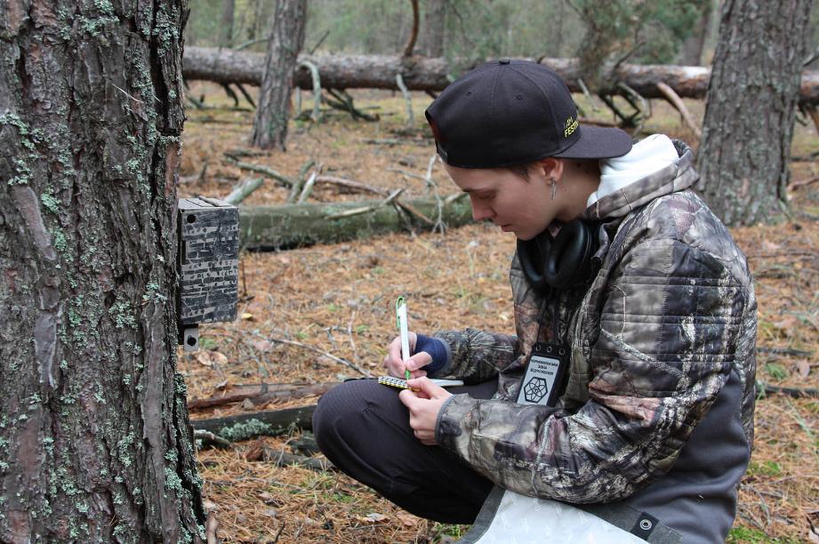 Катерина Корепанова знімає одну з фотопасток, які навесні цього року науковці розставили по території заповідника. Через війну декілька таких фотопасток ще з 2021-го року лишаються на лівому березі Прип’яті, куди науковці зараз не мають доступу. ФОТО: ДМИТРО СІМОНОВ