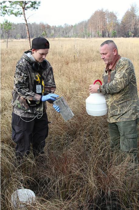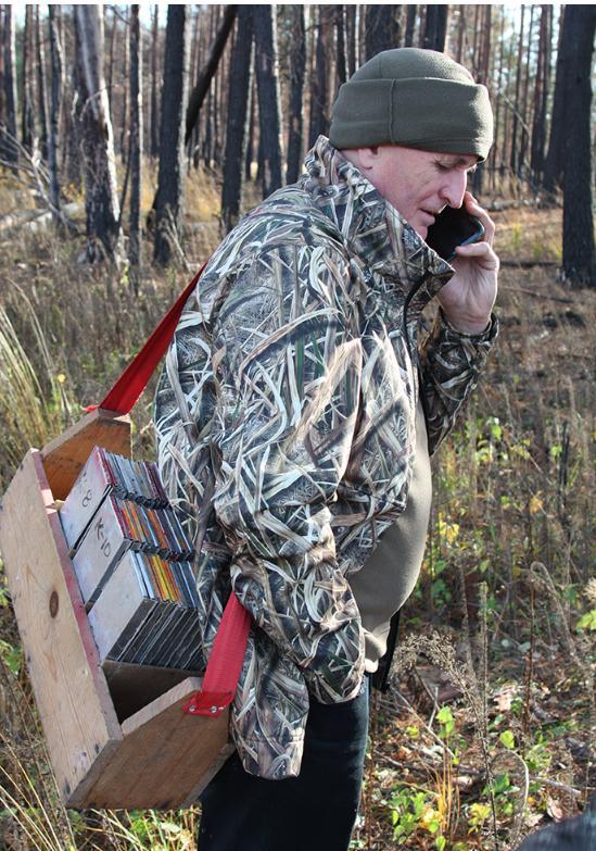 Старший науковий співробітник Чорнобильського заповідника Сергій Обрізан заносить у спеціальний мобільний додаток інформацію про зустріч із зайцем. Фіксація спостережень тварин – обов’язковий елемент роботи науковців у зоні відчуження /праворуч/. Сергій Обрізан – з пастками Шермана для обліку гризунів. Мишей, які до них потрапляють, науковці відпускають на волю подалі, щоб вони не потрапили наступного разу і таким чином не викривляли результат обліку ФОТО: ДМИТРО СІМОНОВ