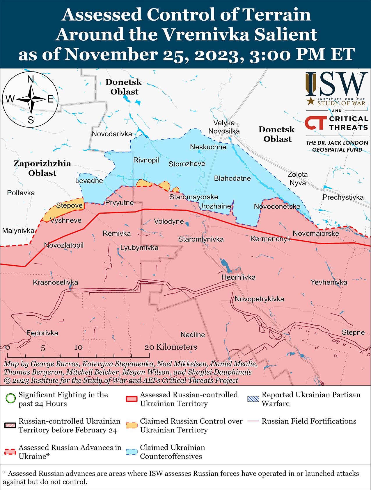 25 ноября враг продолжил наступательные действия в районе Авдеевки и подтвердил наступление. Геолоцированные кадры, опубликованные 24 ноября, свидетельствуют о том, что российские войска продвинулись к северу от Красногоровки (7 км к северо-западу от Авдеевки). [45] Российские источники утверждали, что российские войска продвинулись в промышленной зоне и в районе железнодорожной станции Ясиноватая-2 (оба юго-восточнее Авдеевки), из Каменки (5 км к северо-востоку от Авдеевки) и в районе Авдеевского коксохимического завода. [46] Несколько российских военных блогеров распространили кадры, на которых якобы видно, как часть украинских войск отходит с позиций в промзоне на южном фланге Авдеевки, однако другой блогер утверждал, что российские войска еще не полностью захватили промзону. [47] Российские источники также утверждали, что российские войска продвинулись вблизи Степовое (4 км к северо-западу от Авдеевка) и Новокалиново (11 км к северо-западу от Авдеевка). [48] ISW не может подтвердить ни одно из этих утверждений. Генеральный штаб Вооруженных сил Украины сообщил, что украинские силы отразили наземные атаки противника к востоку и югу от Новокалиново и в районах населенных пунктов Новобахмутовка (13 км к северо-востоку от Авдеевки), Степное, Авдеевка, Северное (6 км к западу от Авдеевки) и Первомайское (11 км к юго-западу от Авдеевки). [49] Спикер Таврийской группировки войск Украины полковник Александр Штупун заявил, что на Авдеевском направлении враг снизил интенсивность авиаударов и уменьшил количество бронетехники, действующей на Авдеевском направлении, но российские войска по-прежнему ведут пехотные атаки. [50]