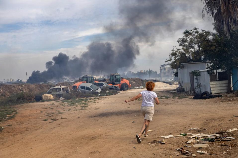 Женщина бежит к бетонному укрытию в своем доме в Ашкелоне, Израиль, после того, как 7 октября прозвучала сирена ракеты. Фото…Тамир Калифа для «Нью-Йорк Таймс»