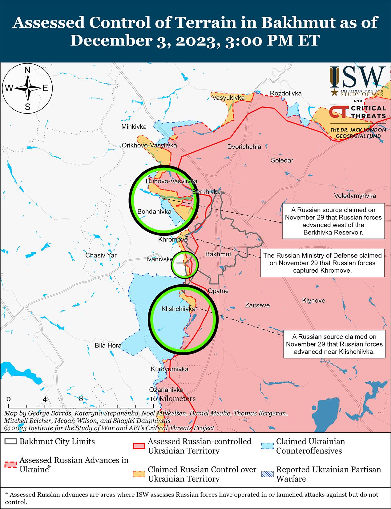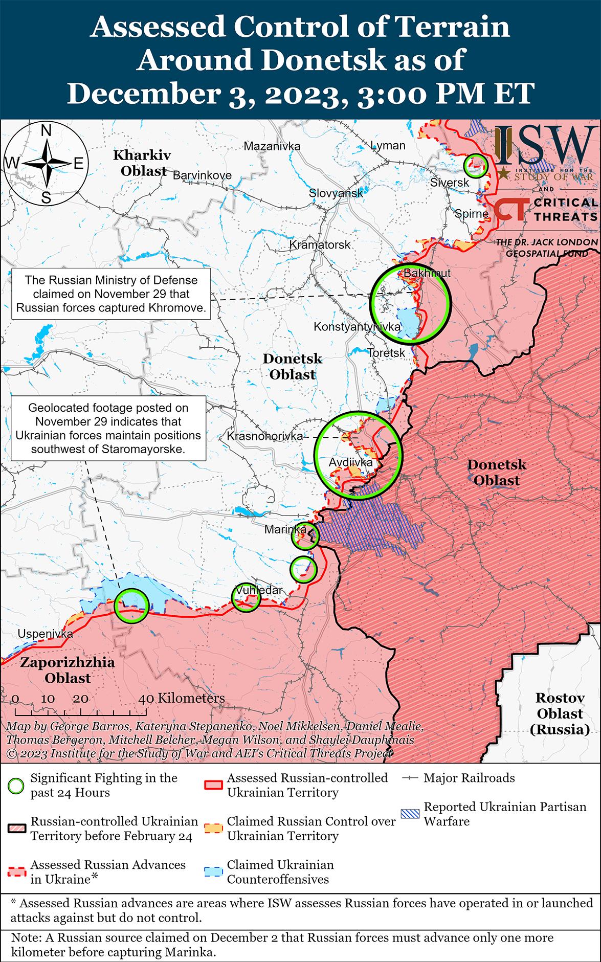 3 декабря российские войска вели наступательные действия в районе Авдеевки и недавно добились подтвержденных успехов. На кадрах, опубликованных 28 ноября и геолоцированных 2 декабря, видно, что российские войска продвинулись к западу от железной дороги к северу от Степовое (3 км к северо-западу от Авдеевки). [49] На дополнительных геолокационных кадрах, опубликованных 2 декабря, видно, что российские войска продвинулись к юго-западу от Первомайское (10 км к юго-западу от Авдеевки). [50] 2 и 3 декабря российские военные блогеры утверждали, что российские войска продвинулись к югу и юго-востоку от Степного, а некоторые российские военные утверждали, что российские войска продвинулись на 300 метров вблизи населенного пункта. [51] 2 и 3 декабря российские военные также утверждали, что российские войска продвинулись южнее Новокалиново (13 км к северо-востоку от Авдеевка) и к западу от Красногоровка (5 км к северо-западу от Авдеевка), а также на южном фланге в районе Первомайское и Северное (6 км к западу от Авдеевка). [52] Генштаб Вооруженных сил Украины сообщил, что российские войска безуспешно атаковали восточнее Новобахмутовка (9 км к северо-западу от Авдеевка) и Новокалиново; к югу от Тоненькое (5 км к западу от Авдеевка); а также вблизи Степного, Авдеевки, Северного и Первомайского. [53] 3 декабря российские источники утверждали, что российские войска также атаковали на северном фланге со стороны Каменки (5 км к северо-востоку от Авдеевки) и на южном фланге в районе промышленной зоны к юго-западу от Авдеевки. [54] 2 декабря российский военный блогер заявил, что российские войска проводят разведку боем и перегруппировываются для возобновления наступательных действий в районе промзоны к юго-востоку от Авдеевки. [55] Глава Авдеевской военной администрации Виталий Барабаш заявил 3 декабря, что российские войска открыли два дополнительных направления для атак по промышленной зоне к юго-востоку от Авдеевки и от Спартака (4 км южнее Авдеевки) во время третьей волны штурмов Авдеевки, чтобы отвлечь внимание украинских сил. [56] Барабаш также заявил, что российские войска ждут улучшения погодных условий, чтобы снова использовать тяжелую технику в наступлении.