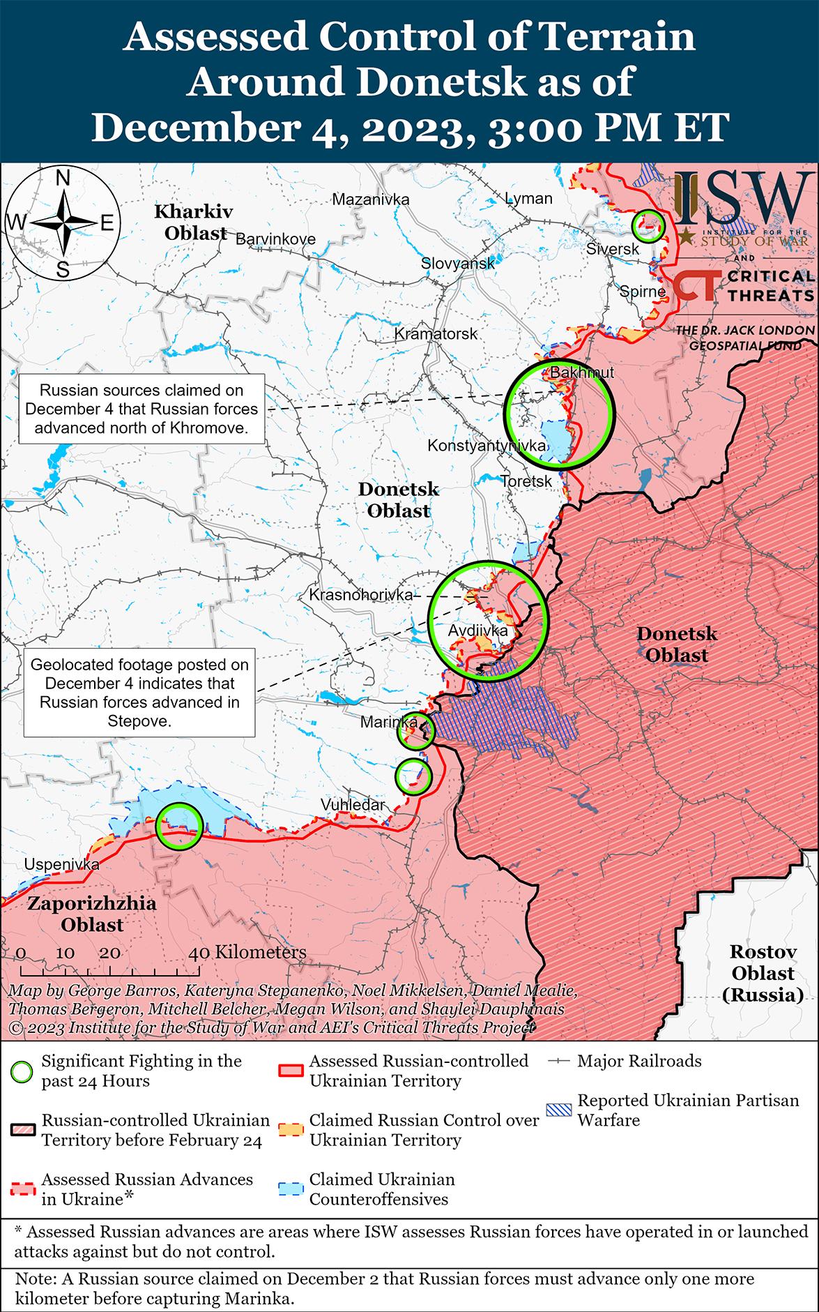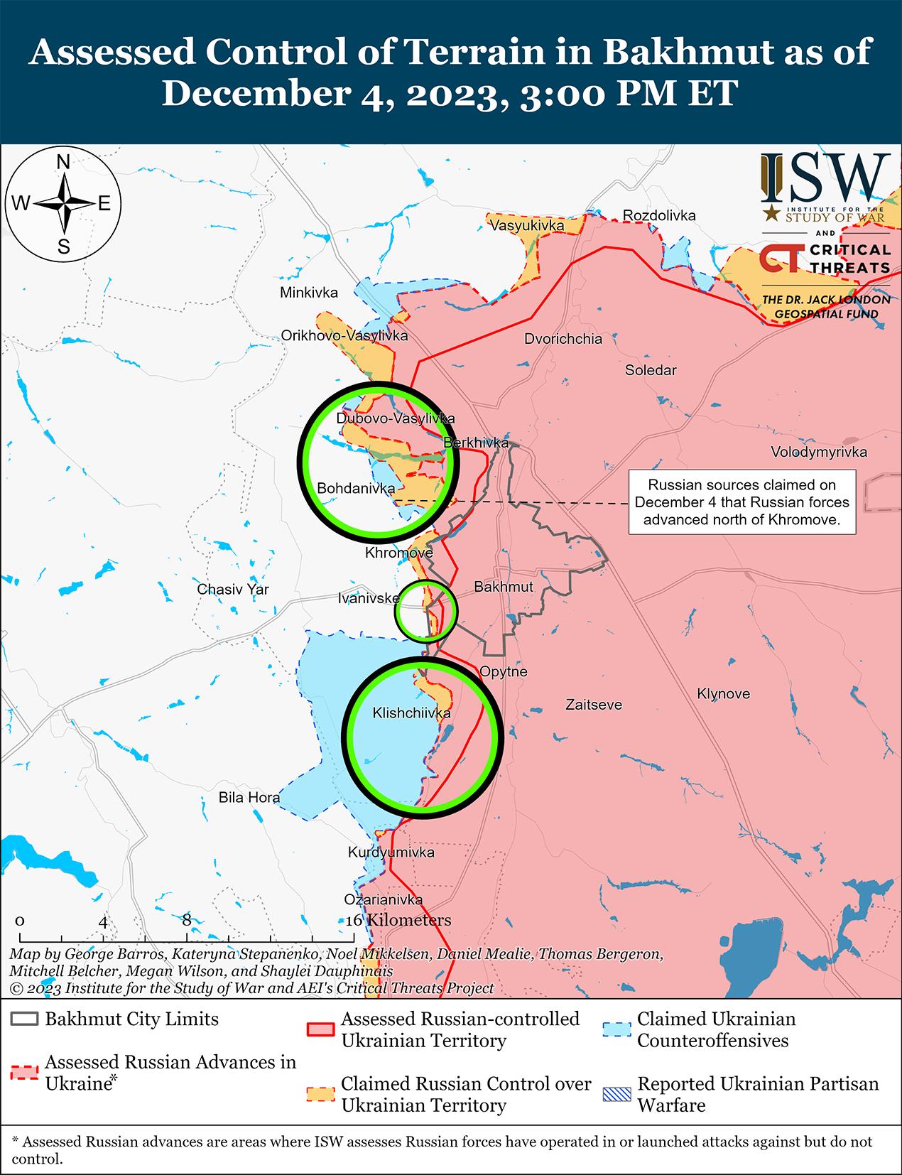 4 декабря российские войска продолжили наступательные действия на Бахмутском направлении и, как сообщается, продвинулись на северо-западном фланге Бахмута. Несколько российских блогеров утверждали, что российские войска захватили питомник растений к северу от Бахмута, вероятно, имея в виду район питомника деревьев возле Богдановки (около 6 км к северо-западу от Бахмута). [39] Российские военные блогеры также утверждали, что российские войска продолжали наступление к западу от Хромова (на северо-западной окраине Бахмута) в направлении Ивановское (5 км к западу от Бахмута) и вдоль линии Клещеевка – Андреевка (5–7 км к юго-западу от Бахмута). [40] Российские источники подтвердили кадры боевых действий различных подразделений Донецкой Народной Республики (ДНР), Луганской Народной Республики (ЛНР) и ВДВ на окраинах Бахмута. [41] Генштаб Украины сообщил о безуспешных атаках россиян вблизи Богдановки, Ивановского, Клещеевки и Андреевки. [42] Украинский Генштаб также подтвердил, что украинские силы продолжают наступательные действия на южном фланге Бахмута. [43]