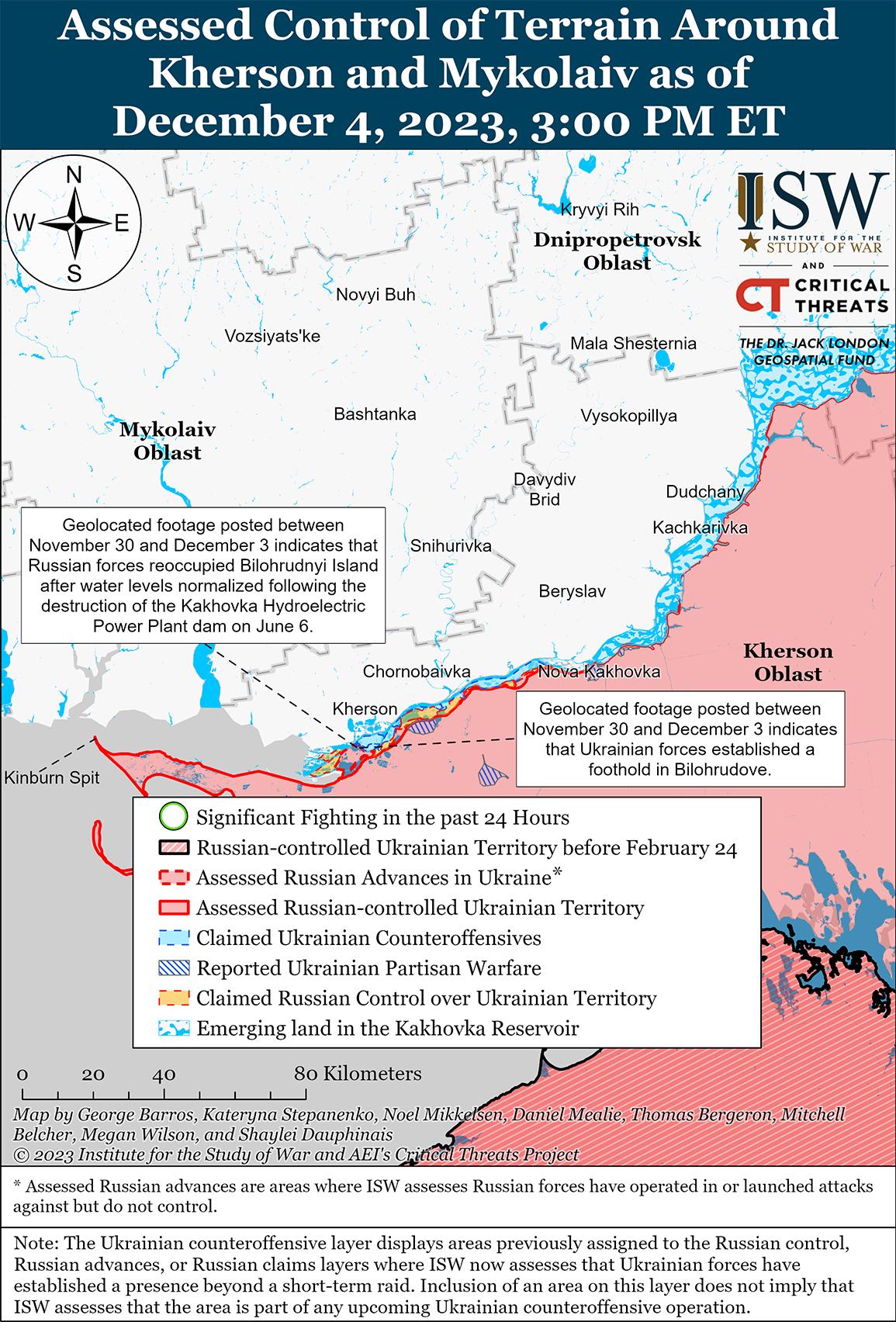4 декабря украинские силовики продолжили наземные действия на восточном (левом) берегу Херсонской области и недавно заняли подтвержденную позицию на острове Белогрудный к юго-западу от Херсона. На геолоцированных кадрах, опубликованных 30 ноября, 1 декабря и 3 декабря, видно, как украинские войска ведут бой с российскими войсками в населенном пункте Белогрудово (11 км к юго-западу от Херсона), что указывает на то, что российские войска, вероятно, контролируют большую часть острова Белогрудный, и что украинские силы недавно заняли позиции возле Белогрудово. [60] Российский военный блогер также утверждал, что по состоянию на 4 декабря украинские войска занимают позиции в Белогрудово. [61] Другой российский блогер утверждал, что украинские войска временно продвинулись южнее Крынки (30 км к северо-востоку от Херсона и 2 км от Днепра), но огонь российской артиллерии вынудил украинские силы отойти с новых позиций. [62] Другие военные блогеры утверждали, что бои в районе Крынки продолжаются, но ни украинские, ни российские войска в последнее время не продвинулись вперед. [63] Российский блогер усилил утверждения о том, что неназванные подразделения ВДВ и 70-й мотострелковой дивизии (18-я общевойсковая армия) испытывают напряженность из-за плохой борьбы с украинскими войсками в Крынках. [64] Украинский военный обозреватель Константин Машовец сообщил, что российская группировка войск «Днепр» в Херсонской области использует плохую погоду для перегруппировки и сосредотачивает основные силы и средства против украинского плацдарма в Крынки. [65]