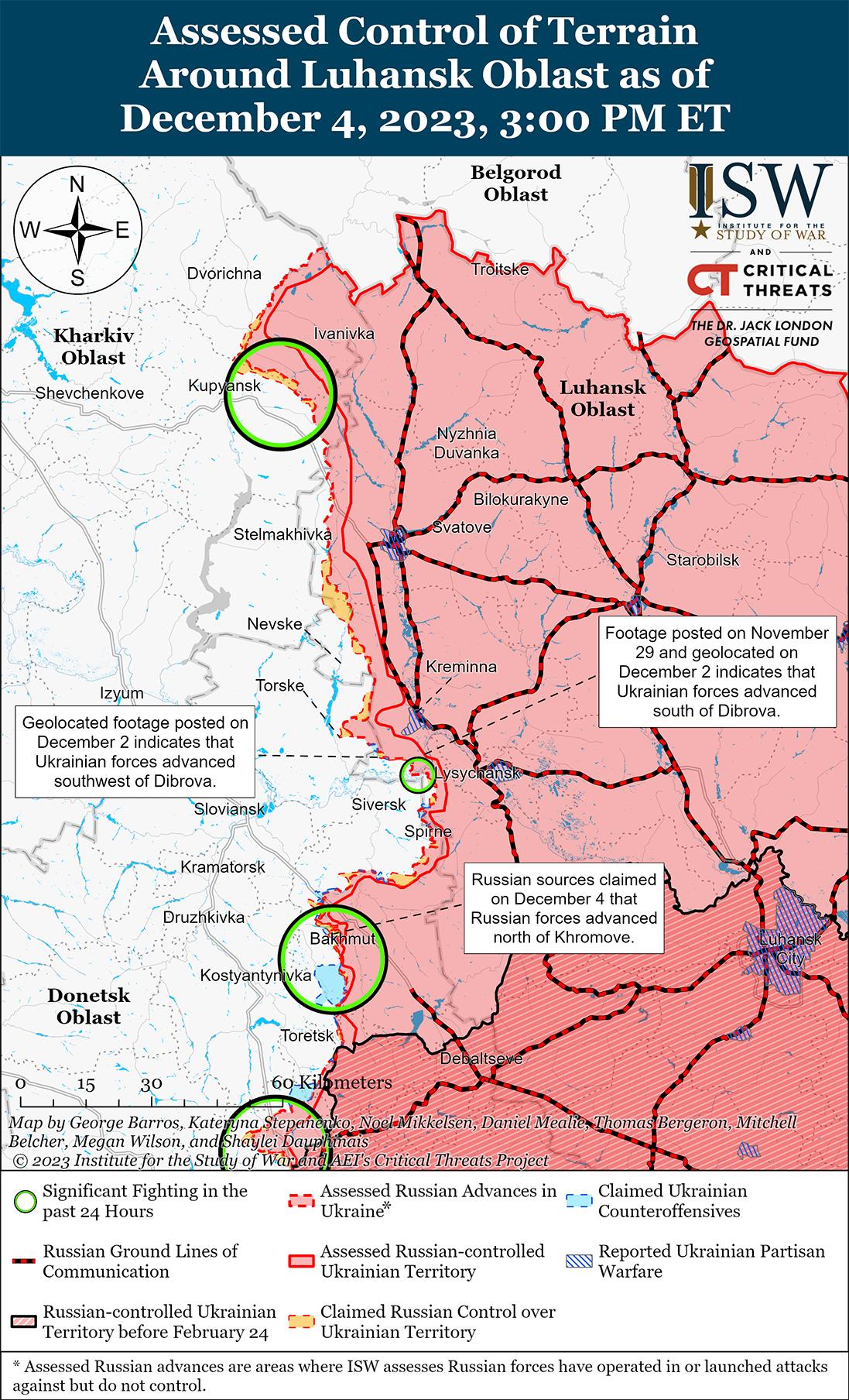 Враг вел наступательные действия на линии Купянск — Сватово — Кременная, но 4 декабря не добился подтвержденных успехов. Российские источники утверждали 3 и 4 декабря, что российские войска продвинулись в районе Синьковка (8 км к северо-востоку от Купянска) и контролируют около половины населенного пункта. [33] Однако ISW не обнаружил визуальных подтверждений значительных успехов России в Синьковке. 4 декабря российский блогер заявил, что российские войска также атаковали к югу от Лиман Перший (12 км к северо-востоку от Купянска) и в районе Першотравнево (21 км к востоку от Купянска). [34] 4 декабря российский военный блогер утверждал, что российские войска продвинулись в районе Торского (15 км к западу от Кременной) и в районе Серебрянского лесного массива (10 км к юго-западу от Кременной)[35] Генеральный штаб Украины сообщил, что российские войска безуспешно атаковали вблизи Синьковка и Петропавловка (7 км восточнее Купянска) на Купянском направлении и в районе Серебрянского лесничества, Терны (17 км к западу от Кременной) и Белогоровка (12 км южнее Кременной) в [36]