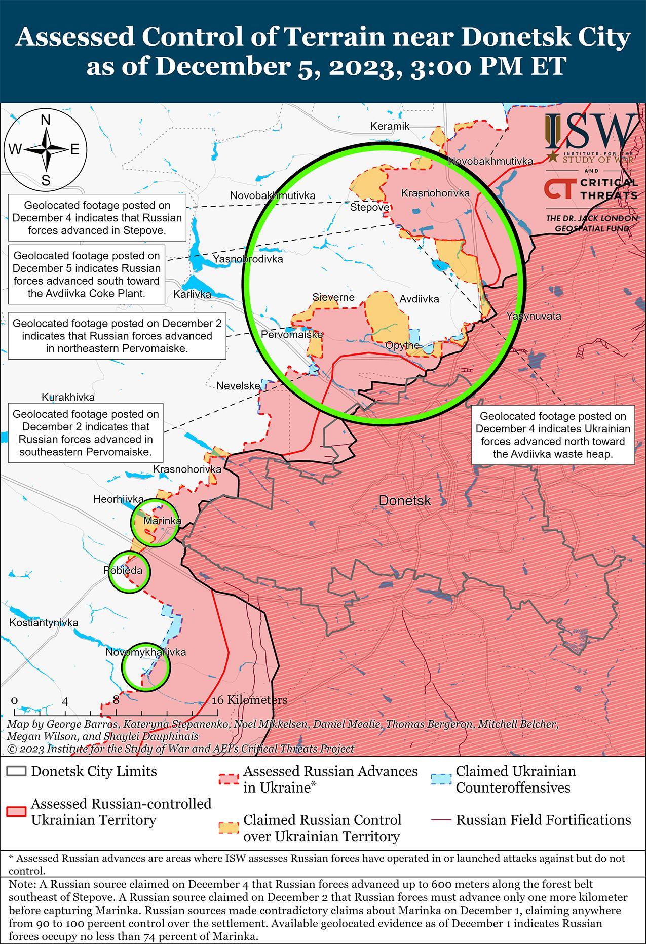 Украинские силы контратаковали в районе Авдеевки 5 декабря и недавно совершили подтвержденное наступление. Геолоцированные кадры, опубликованные 4 декабря, свидетельствуют о том, что украинские силы продвинулись к востоку от участка железной дороги к северу от Авдеевского коксохимического завода. [67] 5 декабря украинский военный обозреватель утверждал, что украинские войска контратаковали севернее Авдеевского коксохимического завода и вынудили российские войска отойти с двух передовых позиций. [68] Российский блогер утверждал, что украинские силы контратакуют в районе Степного и давят на российскую оборону со стороны Новокалиново. [69]