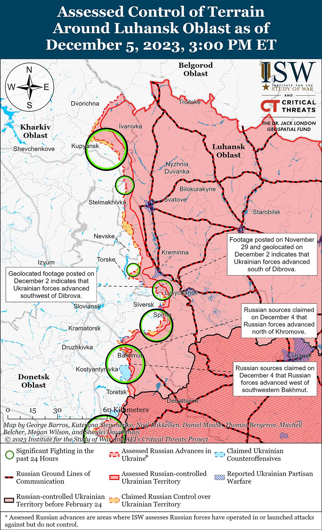 5 декабря враг продолжил наступательные действия на линии Купянск — Сватово — Кременная, но подтвержденных успехов не добился. Генштаб Вооруженных сил Украины сообщил, что украинские силы отразили атаки противника вблизи Синьковка (9 км к северо-востоку от Купянска), Петропавловка (7км к северу от Купянск), Новоселовское (14 км к северо-западу от Сватово), Терны (17 км к западу от Кременная), Серебрянское лесничество (10 км к югу от Кременной), Белогоровка (12 км к югу от Кременной), Спорное (25 км к югу от Кременная) и Веселое (31 км к югу от Кременной). [47] Российские военные блогеры утверждали, что российские войска захватили северные окраины Синьковки, продвинулись до 1 км в районе Торского (15 км к западу от Кременной) и добились неопределенных успехов в районе Ямполовки (17 км к западу от Кременной). [48] Российские военные блогеры утверждали, что российские войска атаковали к югу и юго-западу от Лиман Перший (12 км к северо-востоку от Купянска) и что бои продолжаются в районах Серебрянка (12 км к юго-западу от Кременной) и Григорьевка (11 км к югу от Кременной). [49] Представитель украинской бригады, действующей на Купянском направлении, Надежда Замрига заявила 5 декабря, что российские войска на Купянском направлении снизили плотность артиллерийского огня по сравнению с концом лета 2023 года и используют танки чаще, чем в октябре 2023 года. [50]