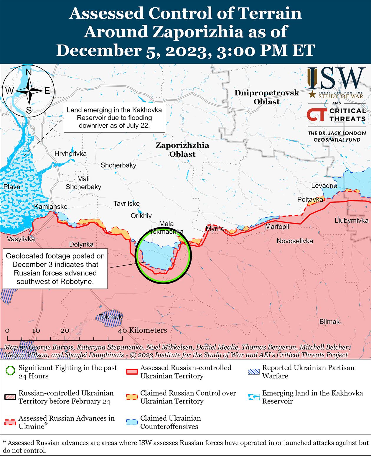 Российские войска вели наступательные действия на западе Запорожской области, но по состоянию на 5 декабря не добились каких-либо подтвержденных успехов. Российский военный блогер заявил, что российские войска захватили несколько украинских позиций возле Роботино, хотя ISW не обнаружил визуальных доказательств этого утверждения. [79] Украинский Генштаб сообщил, что российские войска безуспешно атаковали к югу и западу от Роботино. [80]
