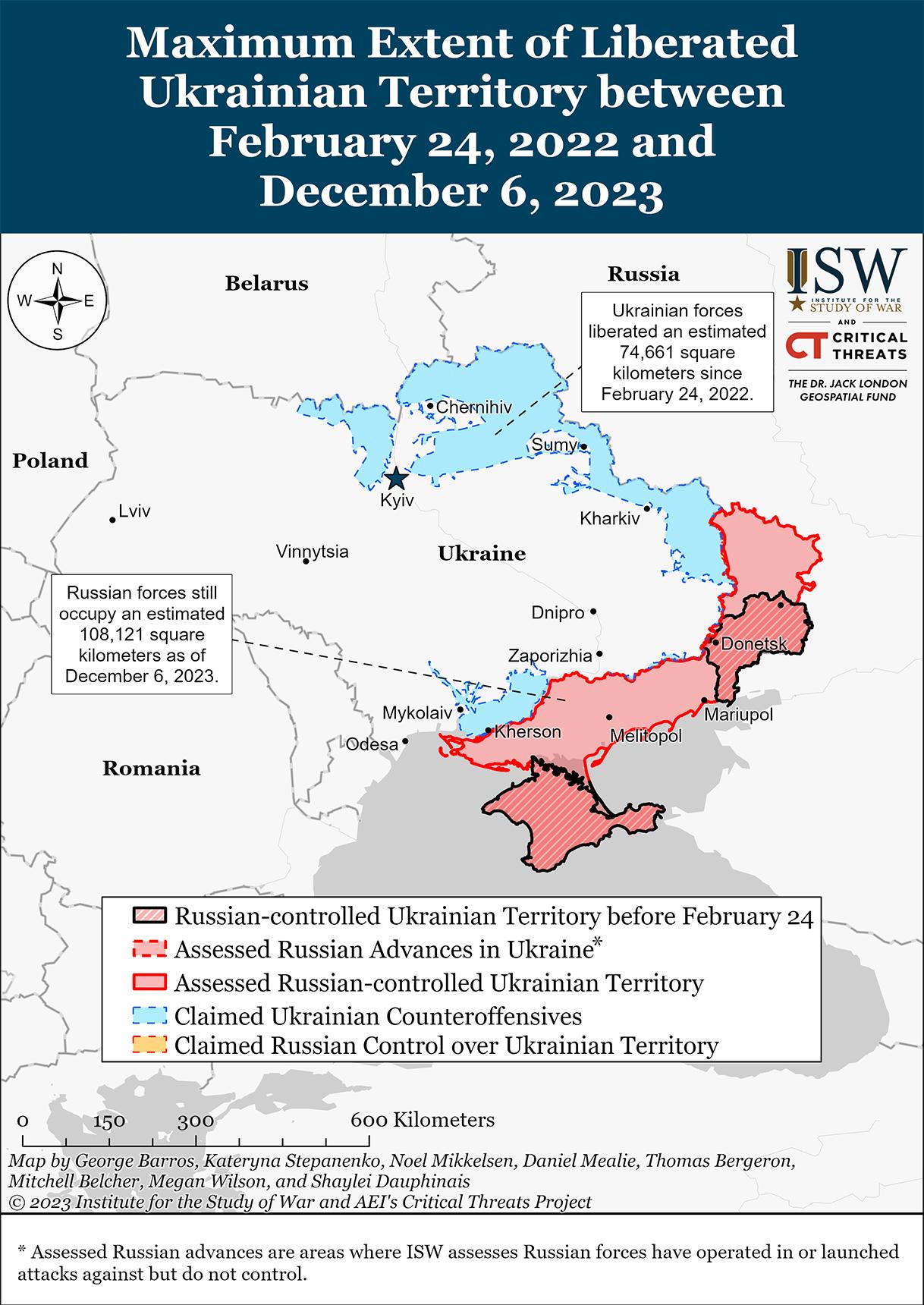 Министр обороны Украины Рустем Умеров считает, что помощь Запада в сфере безопасности позволила украинским силам освободить половину территории, которую Россия оккупировала с 24 февраля 2022 года.[1] В интервью телеканалу Fox News 5 декабря Умеров отдал должное западной помощи в области безопасности за предыдущие успехи украинского контрнаступления и заявил, что у украинских сил есть план на 2024 год. [2] Президент Украины Владимир Зеленский заявил 8 ноября, что украинские силы запланировали несколько путей будущего продвижения в 2024 году, чтобы освободить больше оккупированных территорий. [3] ISW продолжает исходить из того, что Украина должна освободить стратегически важные районы, все еще находящиеся под российской оккупацией, чтобы обеспечить долгосрочную безопасность и экономическую жизнеспособность Украины. [4] Умеров также заявил, что Украина планирует проводить все расчеты по закупкам, закупкам, планированию и операциям в соответствии со стандартами НАТО, и что первоочередной задачей Министерства обороны Украины является вступление Украины в НАТО. [5] Принятие стандартов НАТО во всем украинском военном и оборонном истеблишменте облегчит надзор НАТО за текущей и будущей западной помощью Украине в области безопасности.