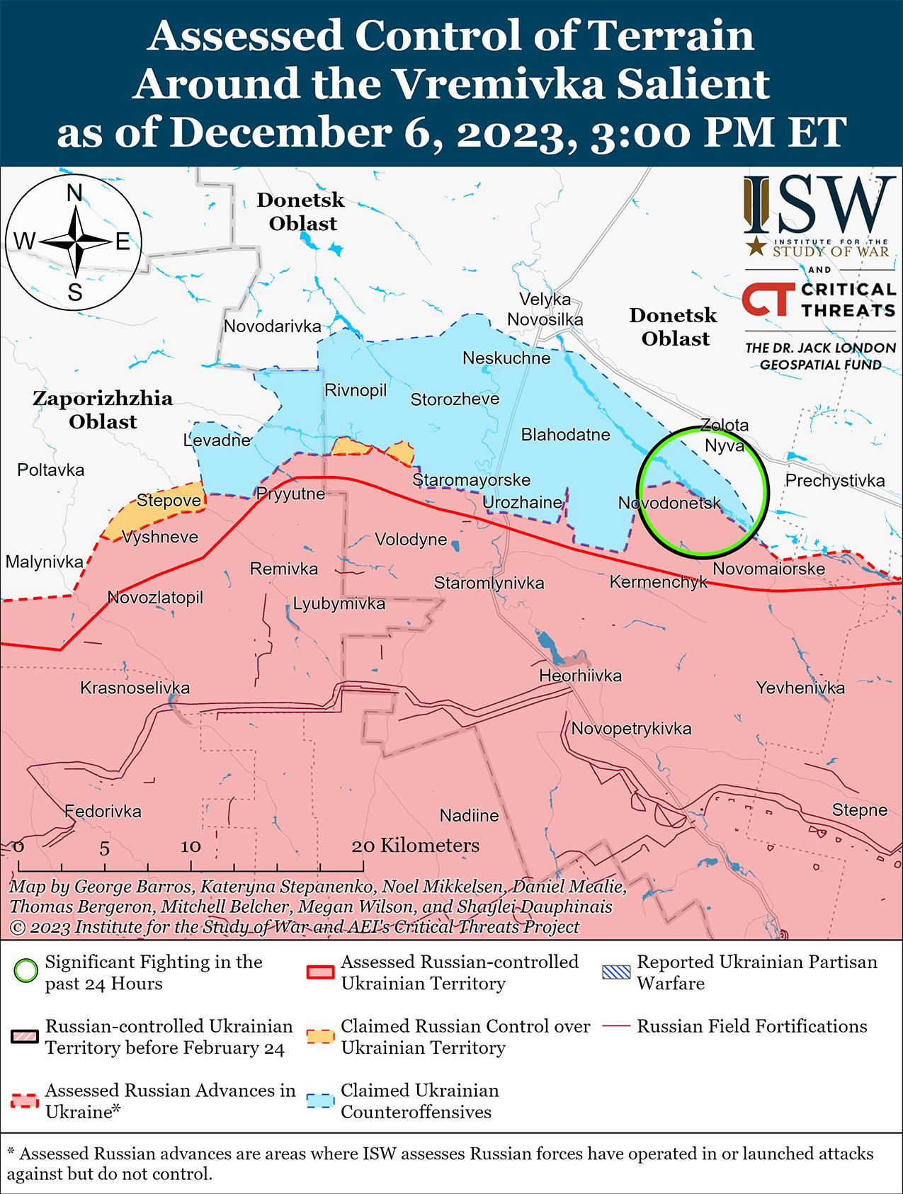 6 декабря российские войска продолжили контратаки на западе Запорожской области и, как сообщается, недавно продвинулись вперед. Российские военные блогеры утверждали, что 5 декабря российские войска продвинулись до километра в глубину в районе Вербовое. [67] Украинский Генштаб сообщал, что 6 декабря украинские силовики отбили не менее пяти российских атак к западу от Вербовое и Роботино. [68] 5 декабря российский военный блогер заявил, что грязные условия в районе Роботино сдерживают передвижение россиян и украинцев. [69]