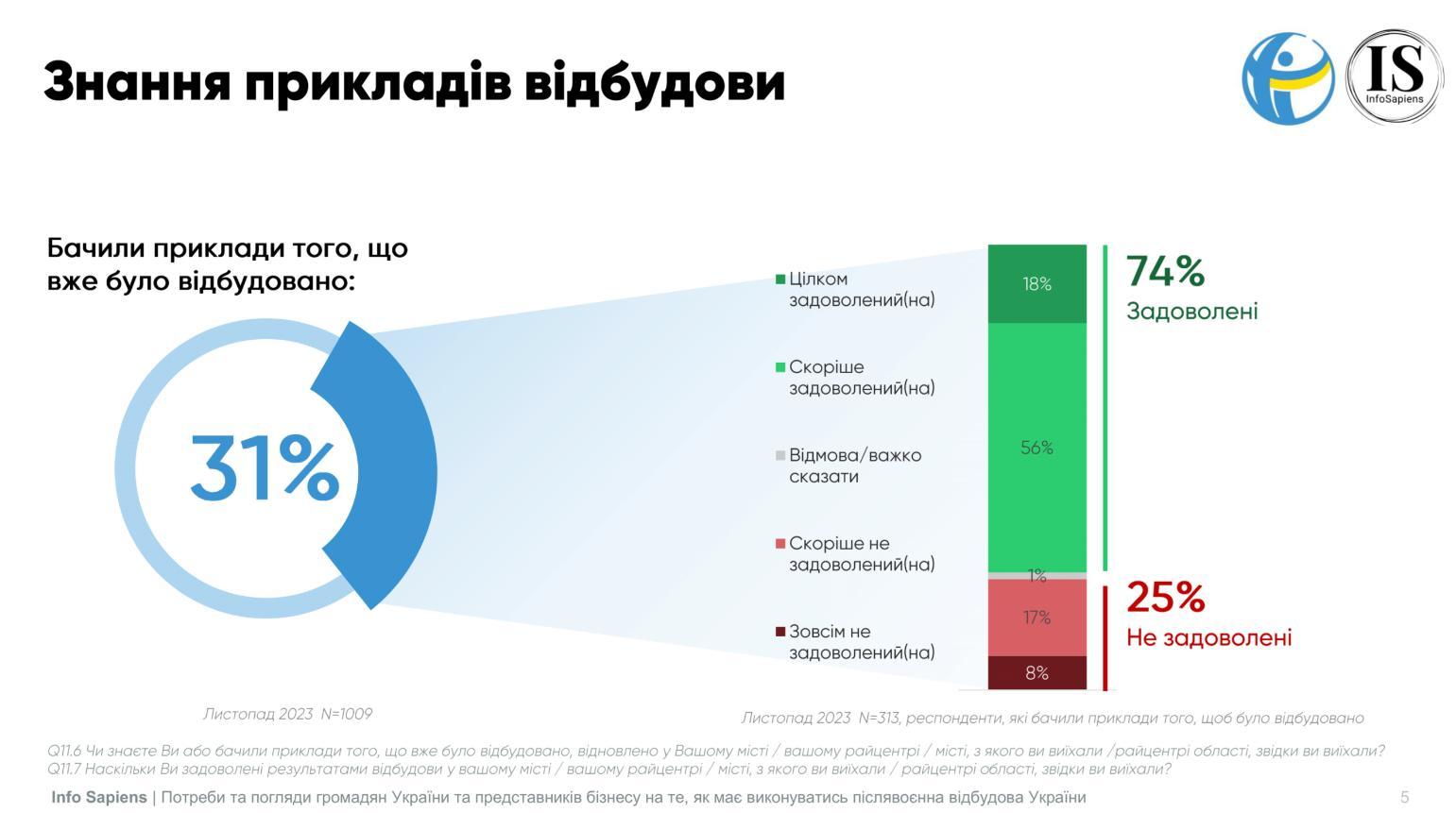 Час також сприяє тому, щоб українці більше залучалися до відбудови й дізнавалися про те, як вона може відбуватися. Наше дослідження показало, що кожен третій дорослий українець знає або бачив приклади того, що вже було відбудовано. І переважна більшість (74%) задоволена результатом.