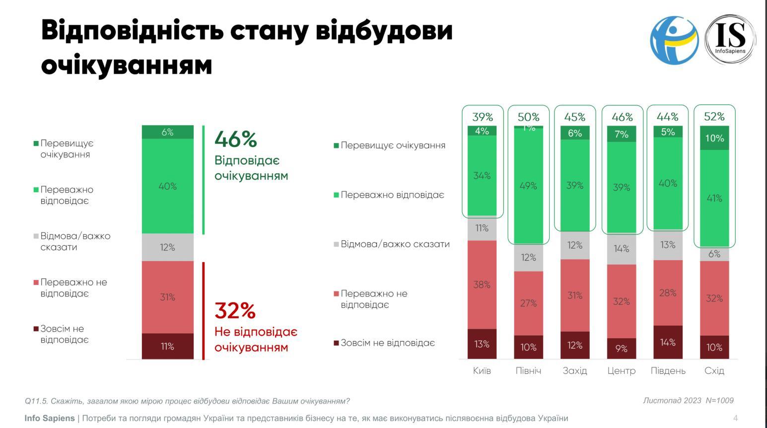 Якщо ж говорити про загальне враження від наявних прикладів відновлення, то воно часто позитивне. Поточний стан відбудови відповідає або перевищує очікування 46% українців, тоді як негативно оцінюють ці процеси 32% респондентів. Цікаво, що найпозитивніше сприйняття відбудови спостерігається в північному (50%) та східному (52%) регіонах України — тобто там, де люди відчутно постраждали після повномасштабного вторгнення.