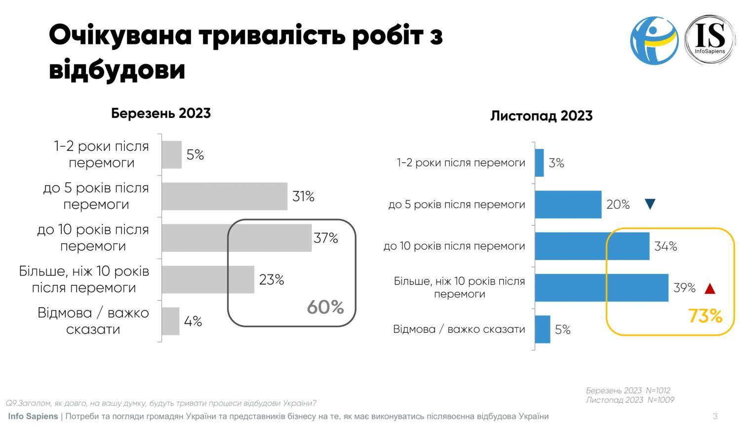 Щодо очікувань українців від процесів майбутньої відбудови, то вони змінили бачення періоду, який може охопити майбутня відбудова. Якщо в березні 60% опитаних вважали, що відбудова може тривати до десяти років і більше, то вже в листопаді це число зросло до 73%. На цей показник передусім уплинули темп і перебіг війни, проте така зміна настроїв також свідчить про готовність до виваженішого діалогу й підходу до самого розуміння відбудови. Це загалом підкреслює зростання реалізму й прагматизму в суспільних настроях.