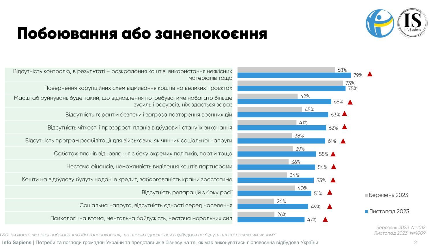 Наприклад, якщо говорити про майбутню відбудову, то й тут страх потенційної корупції займає найвищі позиції в переліку. 79% українців бояться відсутності контролю і як наслідок — розкрадання коштів або використання неякісних матеріалів. А ще 75% остерігаються повернення корупційних схем із відмивання коштів на великих проєктах.