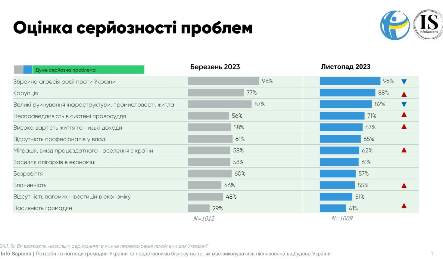 Як і в березні, сьогодні трьома основними проблемами українці вважають війну (96%), корупцію (88%) та руйнування інфраструктури й житла (82%). Але хоч порядок цих проблем залишився незмінним, сприйняття їх помітно посилилося. Причому страхи війни та руйнувань у листопаді дещо зменшилися проти березня (на 2%), а от корупційні ризики зараз турбують українців на 11% більше. Загалом наведені дані засвідчують, що майже кожна згадана в опитувальнику проблема хвилює пересічного українця на 5–10% більше, ніж іще в березні.