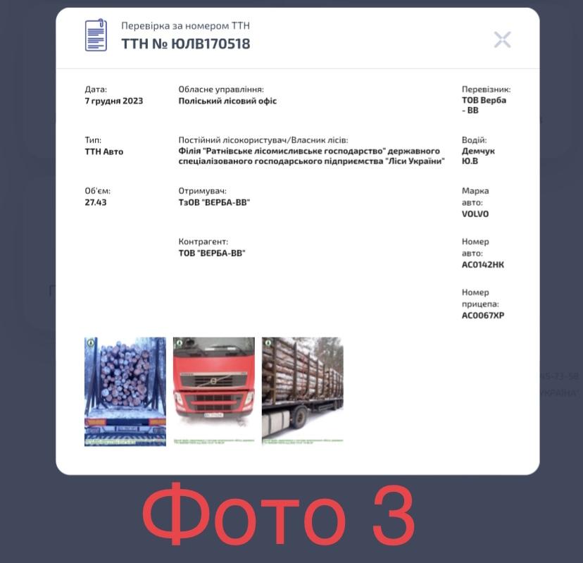 Для перевірки легальності деревини, натискаємо клавішу “ТТН ліс”, нам відразу видає не лише інші дані (фото 3). А фото завантаженої деревни (фото 4, фото 5, фото 6). Звіряємо, чи наявний ліс відповідає зображенню на фото.