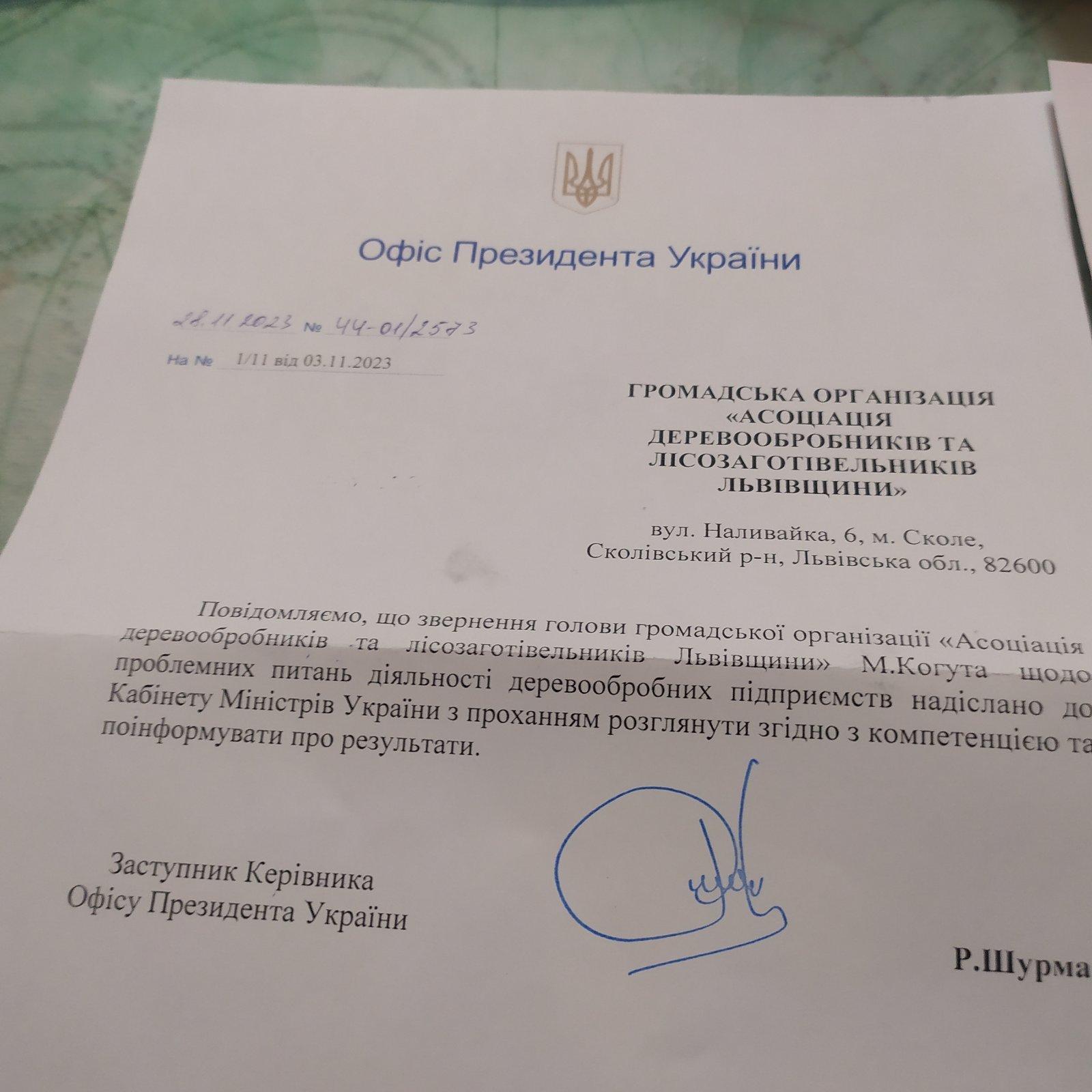Дивна позиція у Шурми. Як проводити нараду з представниками лісової галузі та деревообробного сектору за вибірковим принципом- – так він компетентний. А як дати відповідь на звернення львівських деревообробний – розписується у своїй некомпетентності і переправляє звернення Шмигалю.
