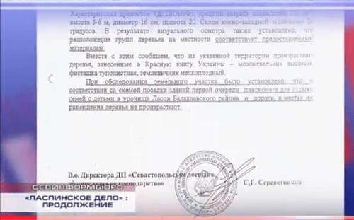Севгосстройнадзор предоставил редакции НТС документ, который на сайте правительства Севастополя назван «справкой из лесничества». Это документ, выданный в 2012 году застройщику Ласпи «Севастопольским опытным лесоохотничьим хозяйством». В нём сказано, что участок будущего строительства осмотрен, средний возраст насаждений на нём составляет 150 лет. На территории произрастают деревья, занесённые в Красную книгу Украины – можжевельник высокий, фисташка туполистная, земляничник мелкоплодный. По утверждению проверяющего, в месте «посадки зданий и дороги» деревья не произрастают. Что совершенно не соответствует спутниковым фотографиям. Документ подписал Сергей Григорьевич Сереветников, руководивший при Украине Севастопольским лесоохотничьим хозяйством и продолжающий трудиться там же в должности заместителя начальника.