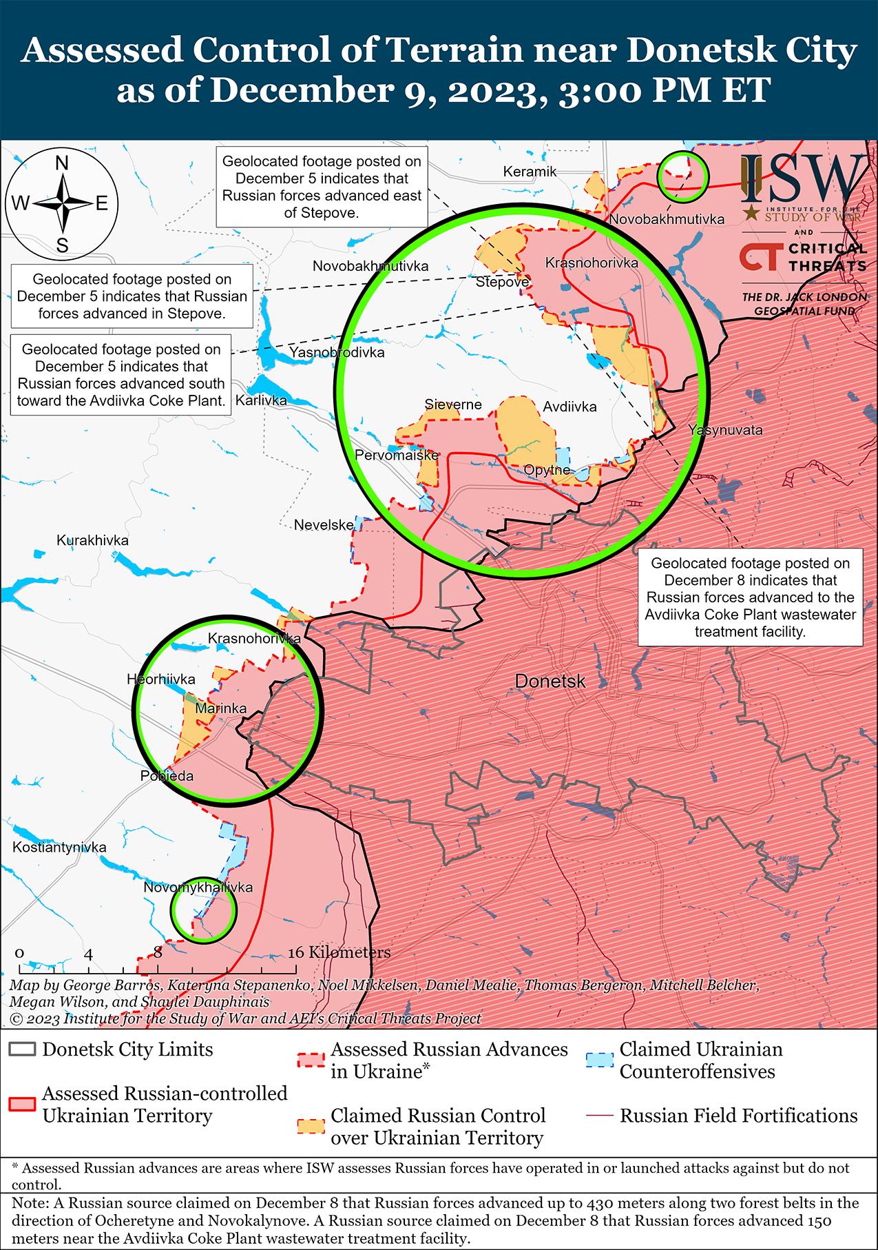 9 декабря российские войска продолжили наступательные действия на Авдеевском направлении и, по сообщениям, добились неподтвержденных успехов. Российские военные утверждали, что российские войска продвинулись в направлении Новобахмутовки (9 км к северо-западу от Авдеевки) и Новокалиново (13 км к северо-востоку от Авдеевки), к юго-востоку от Первомайского (10 км к юго-западу от Авдеевки), вблизи промышленной зоны к юго-востоку от Авдеевки и до 150 метров возле Авдеевского коксохимического завода к северо-западу от Авдеевки. [45] Один российский блогер утверждал, что российские войска закрепились в центре Степовое (3 км к северо-западу от Авдеевки), хотя в ISW не было обнаружено визуальных доказательств этого утверждения. [46] Генштаб Вооруженных сил Украины сообщил, что российские войска безуспешно атаковали восточнее Новобахмутовки, а также в районах населенных пунктов Степное, Авдеевка, Тоненькое (5 км западнее Авдеевки) и Первомайское. [47] Российские блогеры утверждали, что российские войска также атаковали в районе Северное (6 км к западу от Авдеевки), промзоны и Авдеевского коксохимического завода. [48] Украинский журналист Юрий Бутусов заявил, что российские войска используют дистанционно управляемую колесную и гусеничную технику для доставки грузов на передовые позиции и эвакуации раненых на Авдеевском направлении, а российский военный блогер объяснил использование дистанционно управляемой техники высокими потерями российской техники и количеством беспилотников, летающих в этом районе. [49] Однако украинские силы уже наносят удары по этим дистанционно управляемым аппаратам с помощью беспилотников. [50]