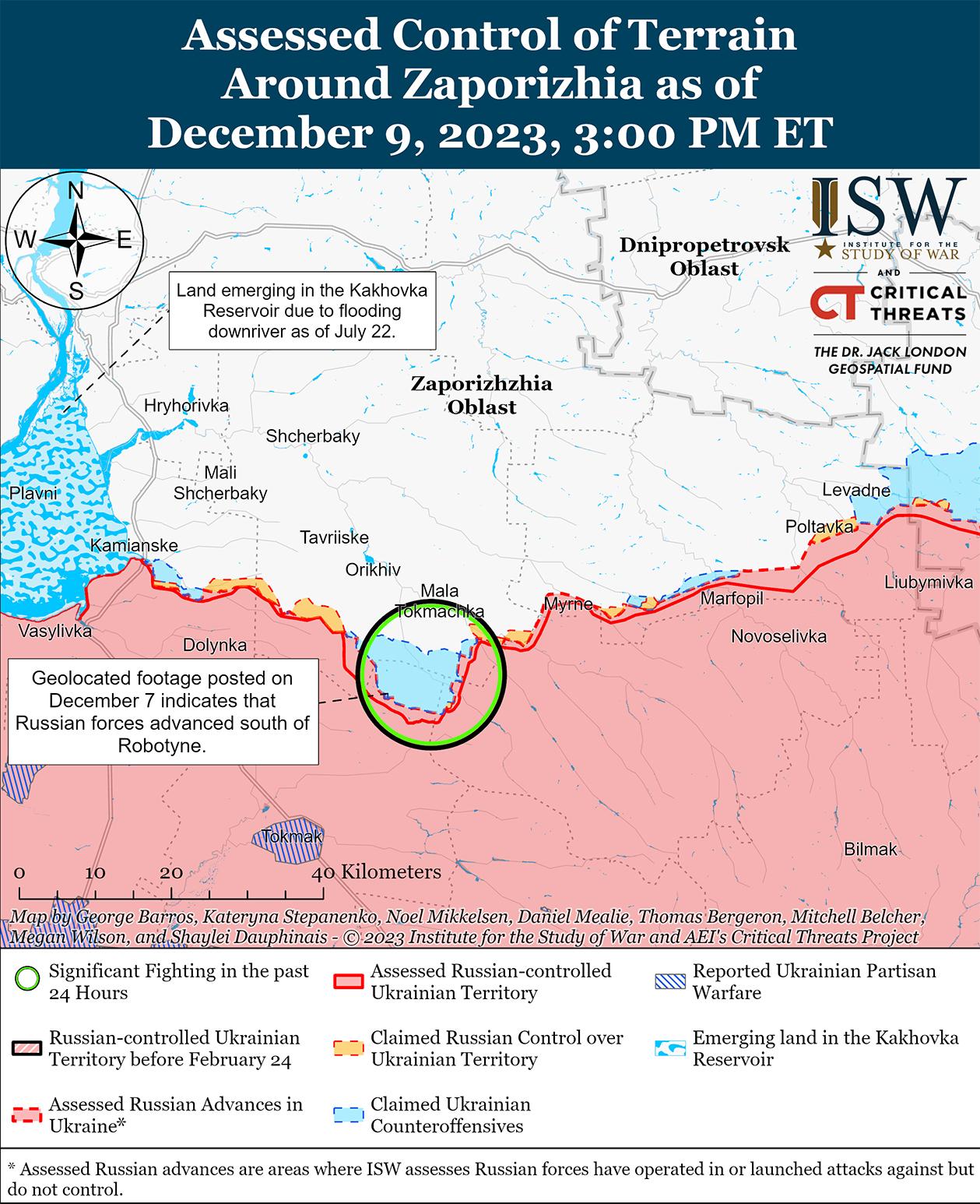 Российские войска контратаковали на западе Запорожской области 9 декабря, но не добились подтвержденных успехов. Генштаб Вооруженных сил Украины сообщил, что украинские силы отразили атаки россиян к западу от Роботино и Вербовое и в районе Новопокровки (16 км к северо-востоку от Роботино). [62] Российские военные блогеры утверждали, что российские войска, вероятно, части российской 76-й гвардейской десантно-штурмовой дивизии (ВДВ), продвинулись к северу от Вербового. [63] Известный российский блогер утверждал, что российские войска также атаковали из Новофедоровки (15 км к северо-востоку от Роботино). [64] Российские военные блогеры утверждали, что плохие погодные условия на западе Запорожской области влияют на наземную активность и обстрелы российских и украинских войск. [65]
