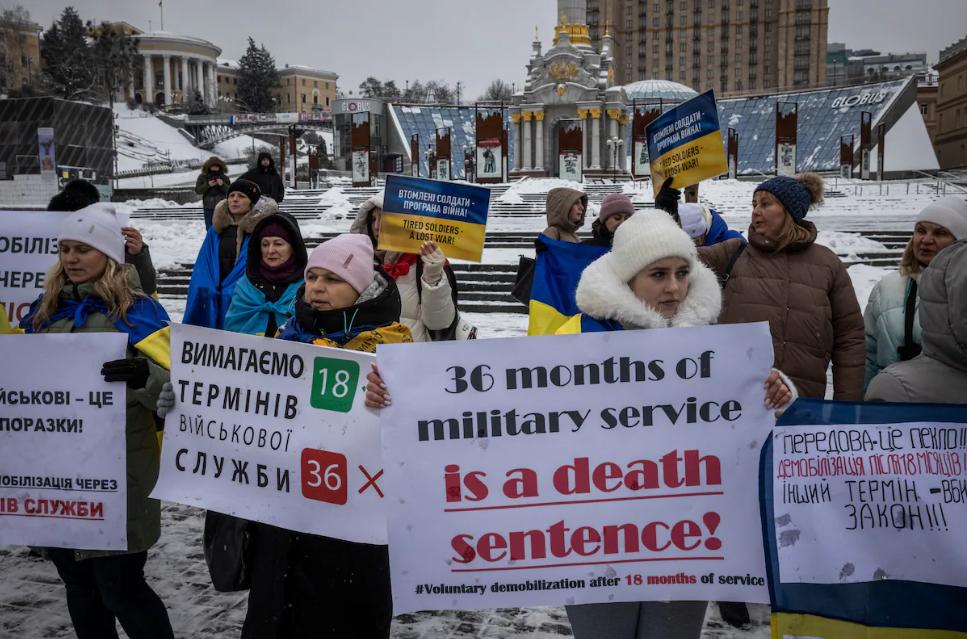 Люди принимают участие в акции протеста с призывом к «добровольной демобилизации после 18 месяцев военной службы» в Киеве в пятницу. (Эд Рам для The Washington Post)
