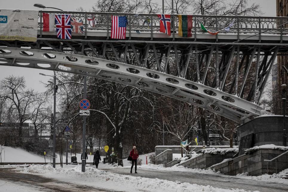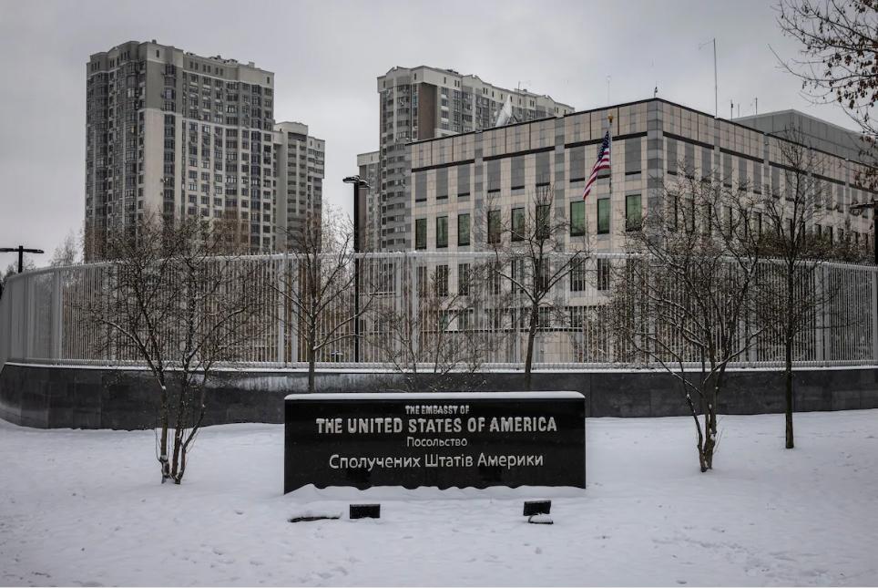 Снег покрывает вывеску посольства США в Киеве в пятницу. (Эд Рам для The Washington Post)