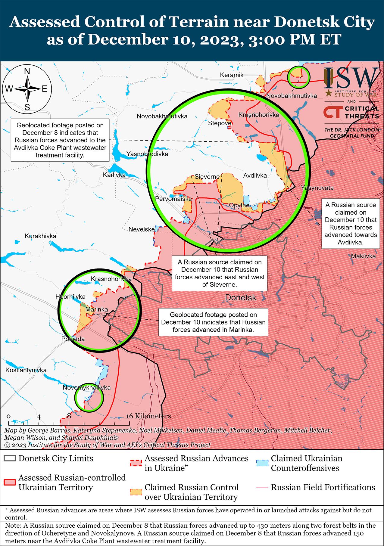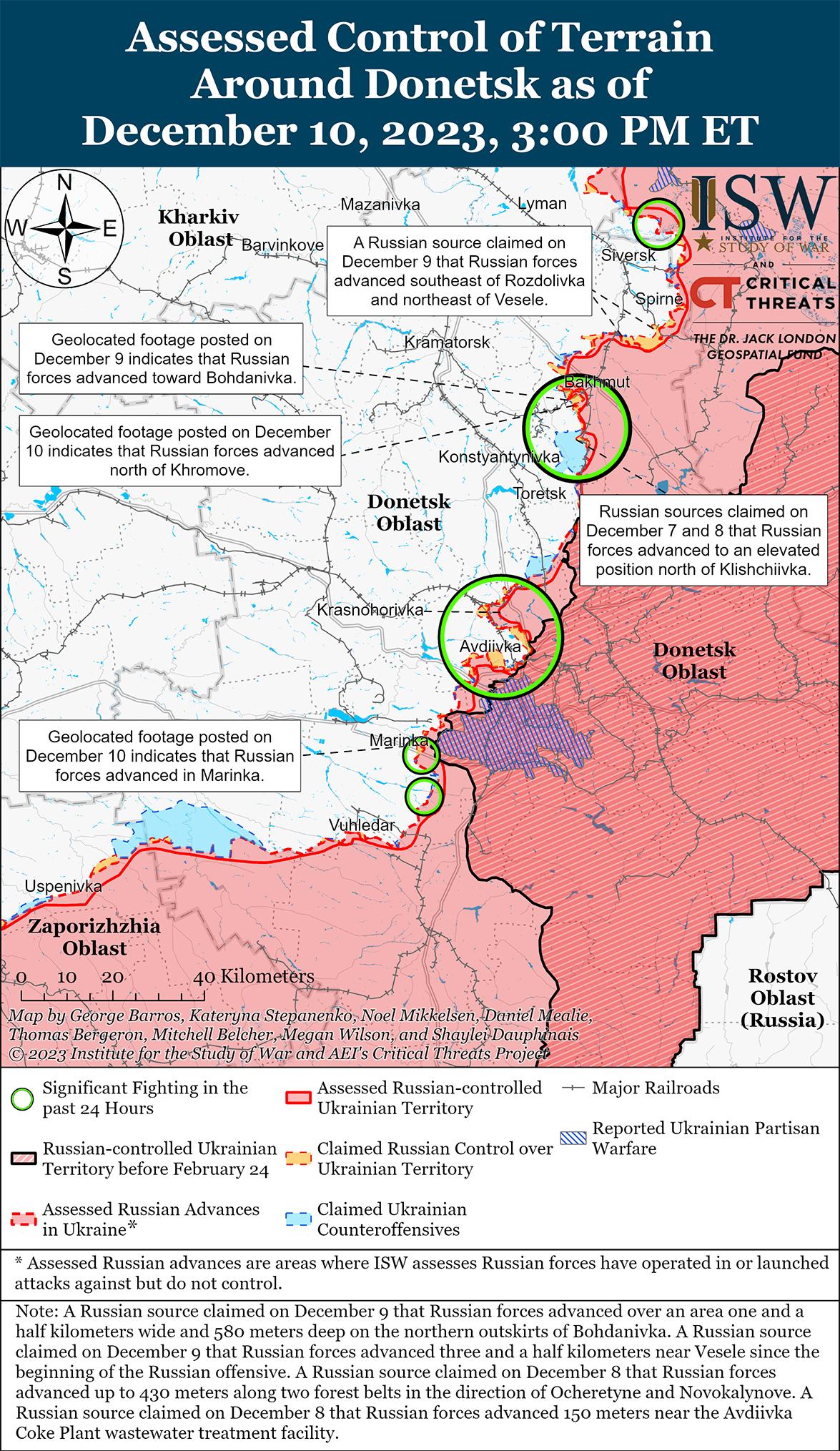 10 декабря российские войска продолжили наступательные действия в районе Авдеевки и недавно подтвердили наступление. Геолоцированные кадры, опубликованные 9 декабря, свидетельствуют о том, что российские войска продвинулись к востоку от Степное (3 км к северо-западу от Авдеевки). [48] Российские военные утверждали, что российские войска продвинулись в Степном к северу от Авдеевского коксохимического завода (северо-западная окраина Авдеевки) и в Авдеевской промышленной зоне к юго-востоку от населенного пункта и атаковали в направлении Новокалиново (13 км к северо-востоку от Авдеевки). [49] Генштаб ВСУ сообщил, что украинские силы отбили не менее 39 российских атак к востоку от Новобахмутовка (9 км к северо-западу от Авдеевки); вблизи Степного, Авдеевки и Первомайского (10 км юго-западнее Авдеевки); и южнее Тоненького (5 км к западу от Авдеевки) и Северного (6 км к западу от Авдеевки). [50] Глава украинской Авдеевской городской военной администрации Виталий Барабаш заявил, что российские войска постоянно атакуют и наносят удары по украинским позициям вблизи Авдеевки, независимо от погодных условий. [51] Российский блогер охарактеризовал Авдеевский фронт как «облегченную версию Бахмутской мясорубки», предположив, что российские войска проводят истощающие пехотные лобовые атаки на украинские укрепления в Авдеевке, что обходится им дорого.[52] Связанный с Кремлем российский блогер заявил, что украинские силы продвинулись в неуказанных лесных массивах в районе Степного.[53]