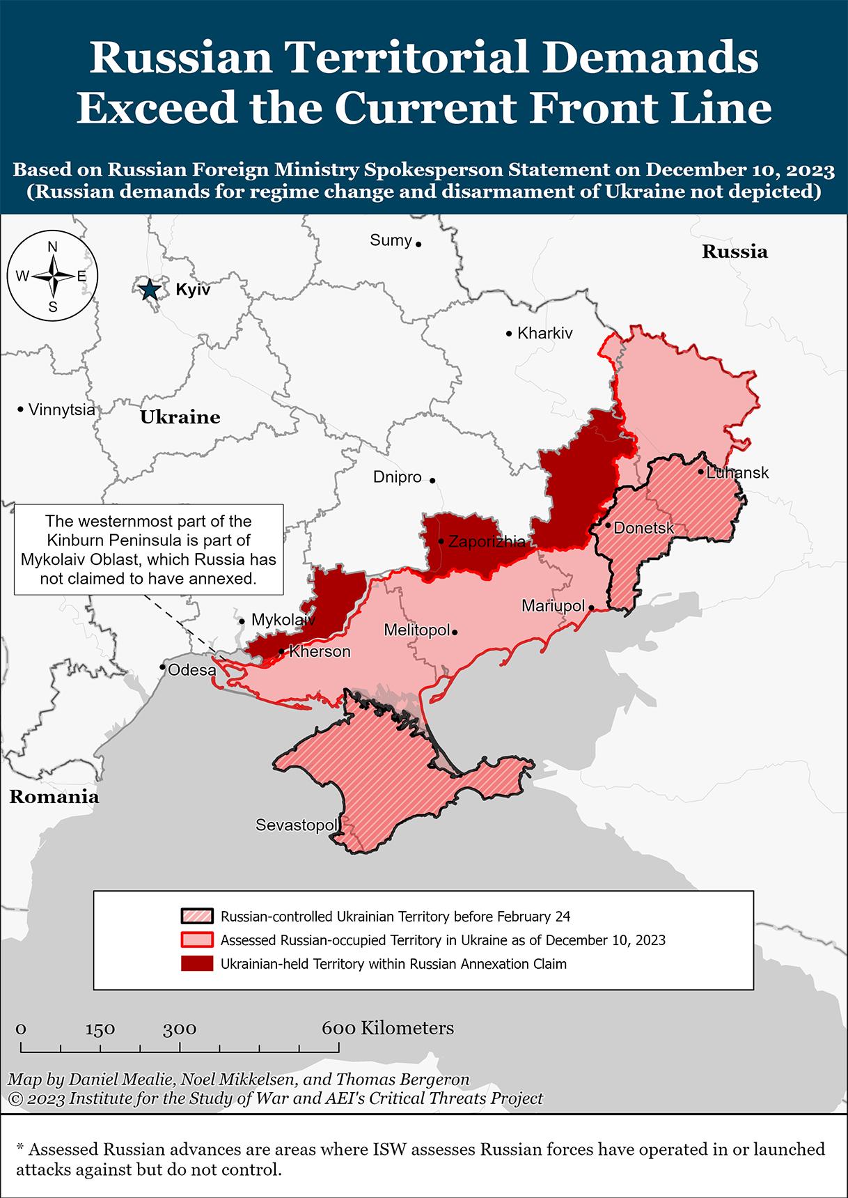 - Требование Захаровой к Украине вывести свои войска с «российской территории» в качестве необходимого предварительного условия для разрешения войны говорит о том, что максималистские цели России включают контроль над всеми четырьмя областями, которые она незаконно аннексировала.
