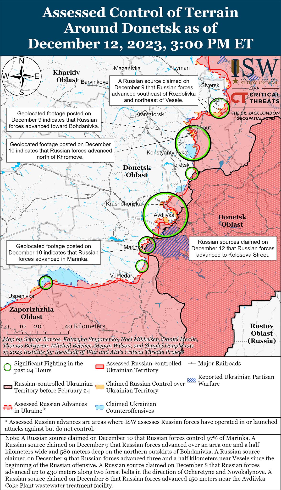 12 декабря враг продолжил наступательные действия в районе Авдеевки в более высоком темпе и подтвердил наступление. Геолоцированные кадры, опубликованные 12 декабря, свидетельствуют о том, что российские войска продвинулись к юго-западу от Авдеевки. [61] Российские военные блогеры утверждали, что российские бронетанковые группы и пехота продвинулись в юго-западную черту города Авдеевка, хотя ISW не обнаружил визуальных доказательств максималистских заявлений военблогеров. [62] Российские военные блогеры утверждали, что российские войска также продвинулись в направлении Новокалиново (13 км к северо-востоку от Авдеевки) и на окраинах Тоненькое (5 км к западу от Авдеевка) и Северное (6 км к западу от Авдеевка). [63] Российские военные блогеры также утверждали, что российские войска продолжали обстрелы в районах населенных пунктов Керамик (14 км к северо-западу от Авдеевки), Авдеевского коксохимического завода (северо-западная окраина Авдеевки) и Первомайское (10 км к юго-западу от Авдеевки). [64] Генштаб ВСУ сообщал, что украинские силы отбили не менее 42 российских атак к востоку от Новокалиново и Новобахмутовка (9 км к северо-западу от Авдеевка); вблизи Степное (3 км к северо-западу от Авдеевка), Авдеевка, Первомайское и Невельское (14 км к юго-западу от Авдеевка); и к югу от Северное и Тоненькое. [65] Командующий украинской Таврийской группировкой войск бригадный генерал Александр Тарнавский заявил, что 10 декабря российские войска начали массированное наступление с применением бронетехники на Авдеевском направлении и продолжили эти штурмы при поддержке с воздуха. [66] Связанный с Кремлем военный блогер охарактеризовал возобновление российских штурмов Авдеевки как начало «следующего этапа» наступательных операций России вокруг населенного пункта. [67] 12 декабря пресс-секретарь украинского подразделения, работающего на Авдеевском направлении, заявил, что 11 декабря украинские войска контратаковали и вытеснили российские войска с позиций в районе Степного. [68]