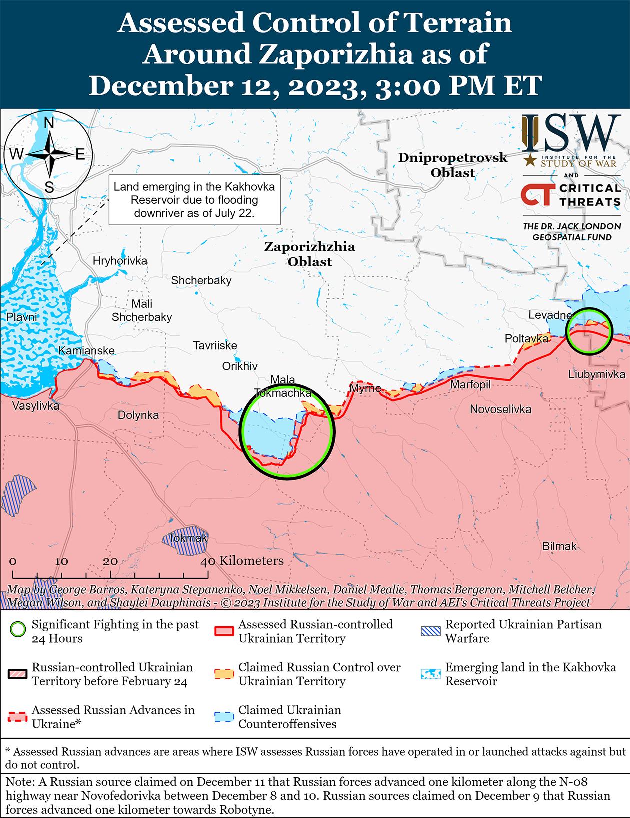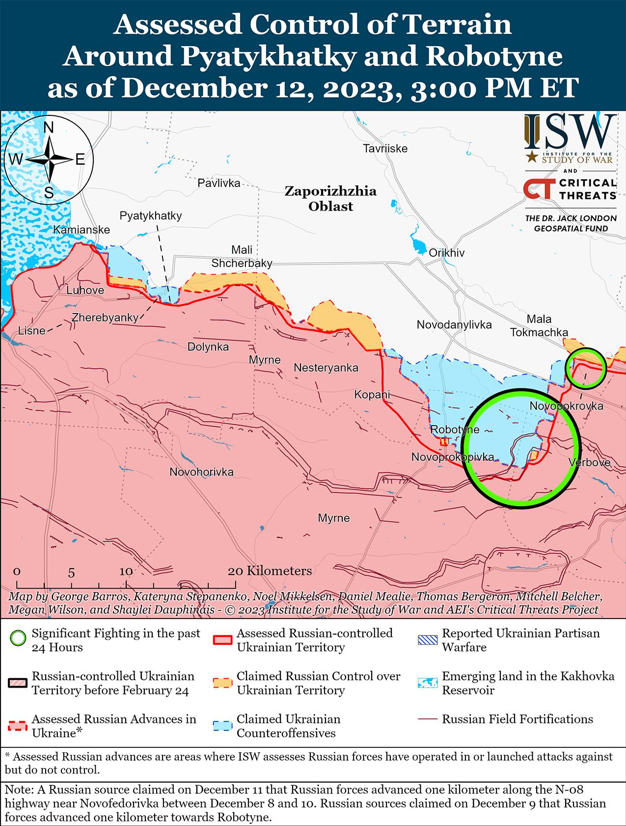 12 декабря российские войска вели наступательные действия на западе Запорожской области и недавно подтвердили их наступление. На геолоцированных кадрах, опубликованных 10 декабря, видно, что российские войска продвинулись к востоку от Новопрокоповки (2 км к югу от Роботино). [79] Глава оккупационной власти Запорожской области Евгений Балицкий заявил 12 декабря, что российские войска значительно продвинулись к северо-востоку от Новопокровки (13 км к северо-востоку от Роботино), хотя ISW не обнаружил визуальных доказательств этого заявления. [80] Генштаб Вооруженных сил Украины сообщил, что российские войска безуспешно атаковали западнее Вербовое (9 км к востоку от Роботино) и западнее Новопокровка. [81] Российские военные блогеры утверждали, что российские войска также атаковали в районе Роботино и из Новофедоровки (15 км к северо-востоку от Роботино). [82] В МО РФ заявили, что на Запорожском направлении действуют подразделения 7-й воздушно-десантной дивизии (ВДВ) РФ. [83]