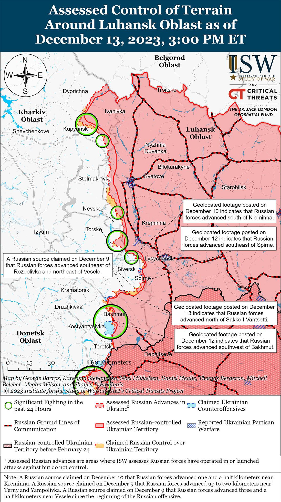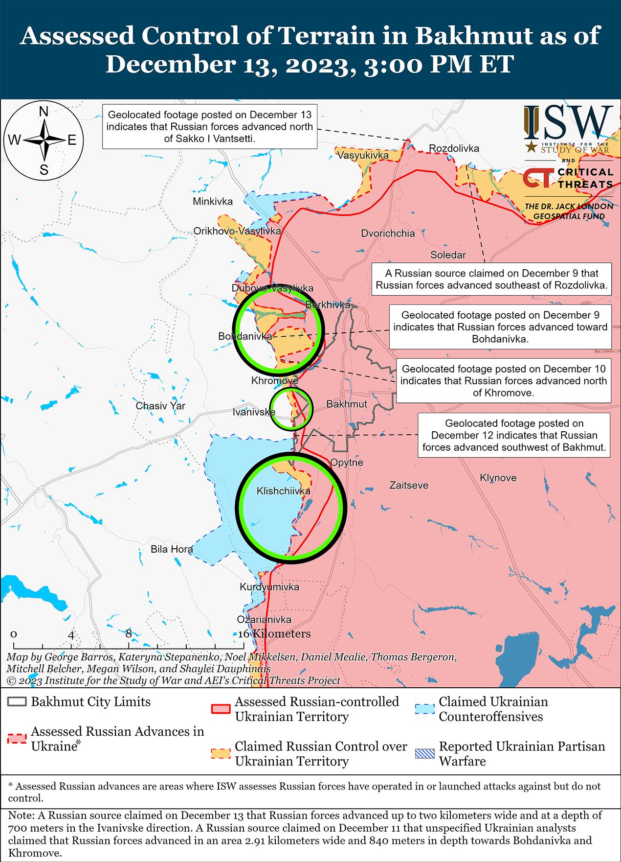 13 декабря враг продолжил наступательные действия в районе Бахмута и подтвердил наступление. Геолоцированные кадры, опубликованные 12 декабря, свидетельствуют о том, что российские войска продвинулись к северу от Клещеевки (7 км к юго-западу от Бахмута). [62] Генштаб Вооруженных сил Украины сообщил, что украинские силовики отбили не менее пяти атак противника в районах населенных пунктов Богдановка (6 км к северо-западу от Бахмута), Ивановское (6 км к западу от Бахмута), Клещеевка и Андреевка (10 км к юго-западу от Бахмута). [63] Несколько российских военных блогеров утверждали, что российские войска продвинулись к северо-востоку и востоку от Богдановки и взяли под контроль участок дороги Григорьевка – Богдановка (6-9 км к северо-западу от Бахмута), хотя визуальных доказательств этих заявлений ISW не наблюдалось. [64] Российский военный блогер утверждал, что российские войска продвинулись в направлении Ивановского по фронту шириной два километра и глубиной 700 метров, хотя ISW не обнаружил визуальных подтверждений этого утверждения. [65] Российский блогер утверждал, что бои продолжаются в районе Хромова (к западу от Бахмута). [66] Алексей Тарасенко, офицер украинской бригады, действовавшей под Бахмутом, заявил, что российские войска добились некоторого прогресса в направлениях Ивановское, Клещеевка и Андреевка, потому что три недели назад российские военные направили в эти районы «отборных обученных бойцов», но в последнее время российские военные начали перебрасывать в эти районы плохо экипированных мобилизованных, что замедлило продвижение российских войск. [67]