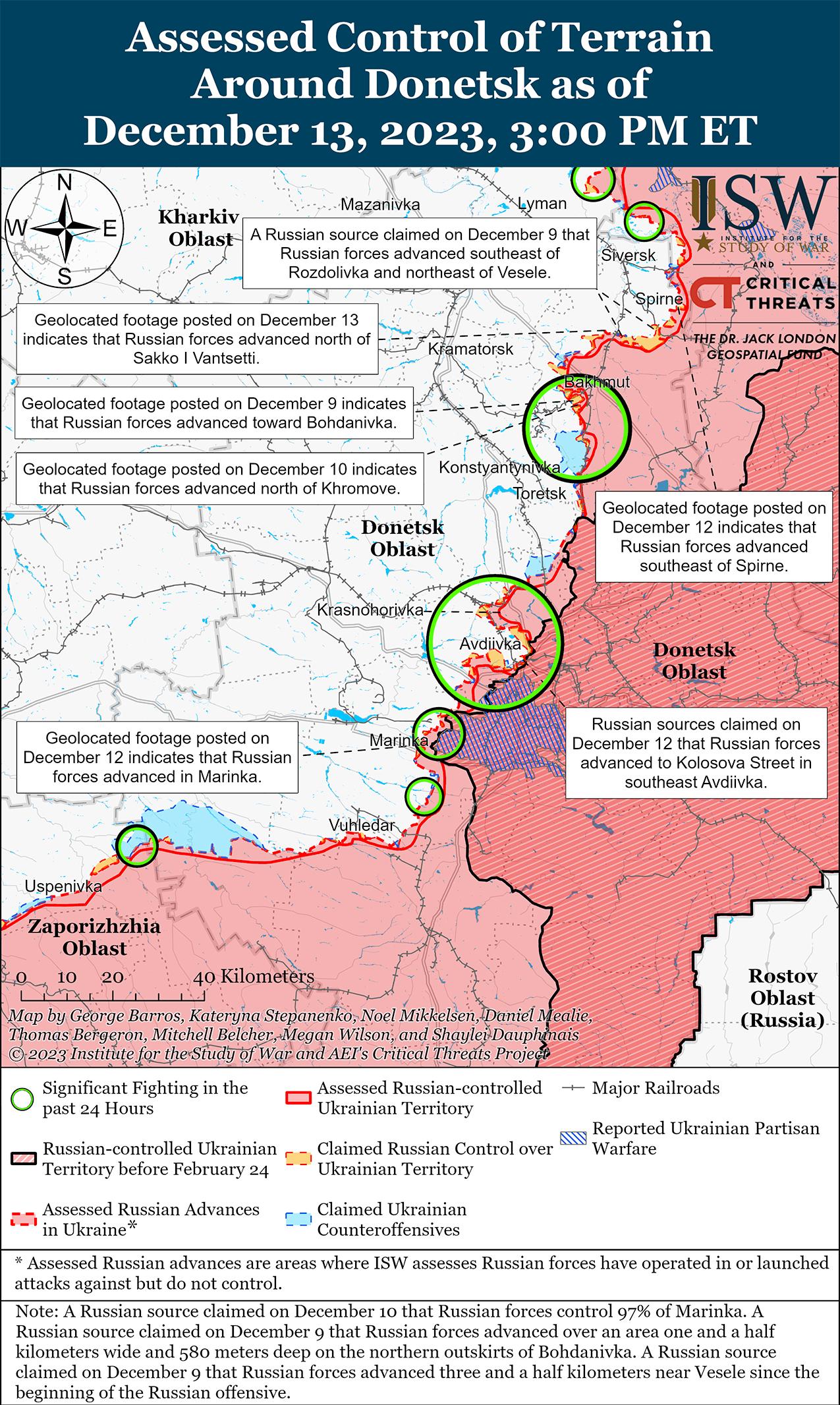 13 декабря российские войска продолжили наступательные действия в районе Авдеевки и недавно подтвердили наступление. На геолоцированных кадрах, опубликованных 13 декабря, видно, что российские войска незначительно продвинулись к юго-востоку от Степное (3 км к северо-западу от Авдеевки). [70] Генштаб Вооруженных сил Украины сообщил, что украинские силы отбили по меньшей мере 51 атаку противника к востоку от Новокалиново (13 км к северо-востоку от Авдеевка) и Новобахмутовка (9 км к северо-западу от Авдеевка); вблизи Степного, Авдеевки, Первомайского (10 км к юго-западу от Авдеевки) и Невельского (14 км к юго-западу от Авдеевки); и южнее Тоненького (5 км к западу от Авдеевки) и Северного (6 км к западу от Авдеевки). [71] Несколько российских блогеров утверждали, что российские войска продвинулись в промышленной зоне (к юго-западу от Авдеевки) и к востоку от Авдеевского коксохимического завода (к северо-западу от Авдеевки), хотя ISW не обнаружил визуальных доказательств этого заявления. [72] Российский блогер утверждал, что российские войска продолжали обстрелы в районе Степного и к северу от Водяное (7 км к юго-западу от Авдеевки). [73]