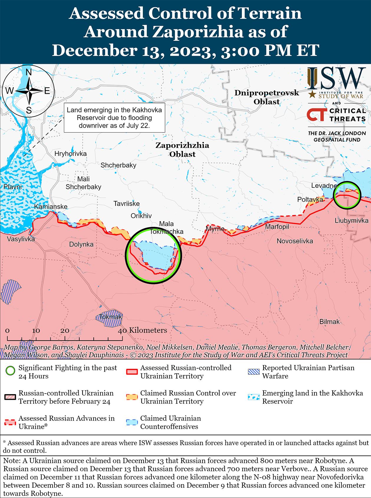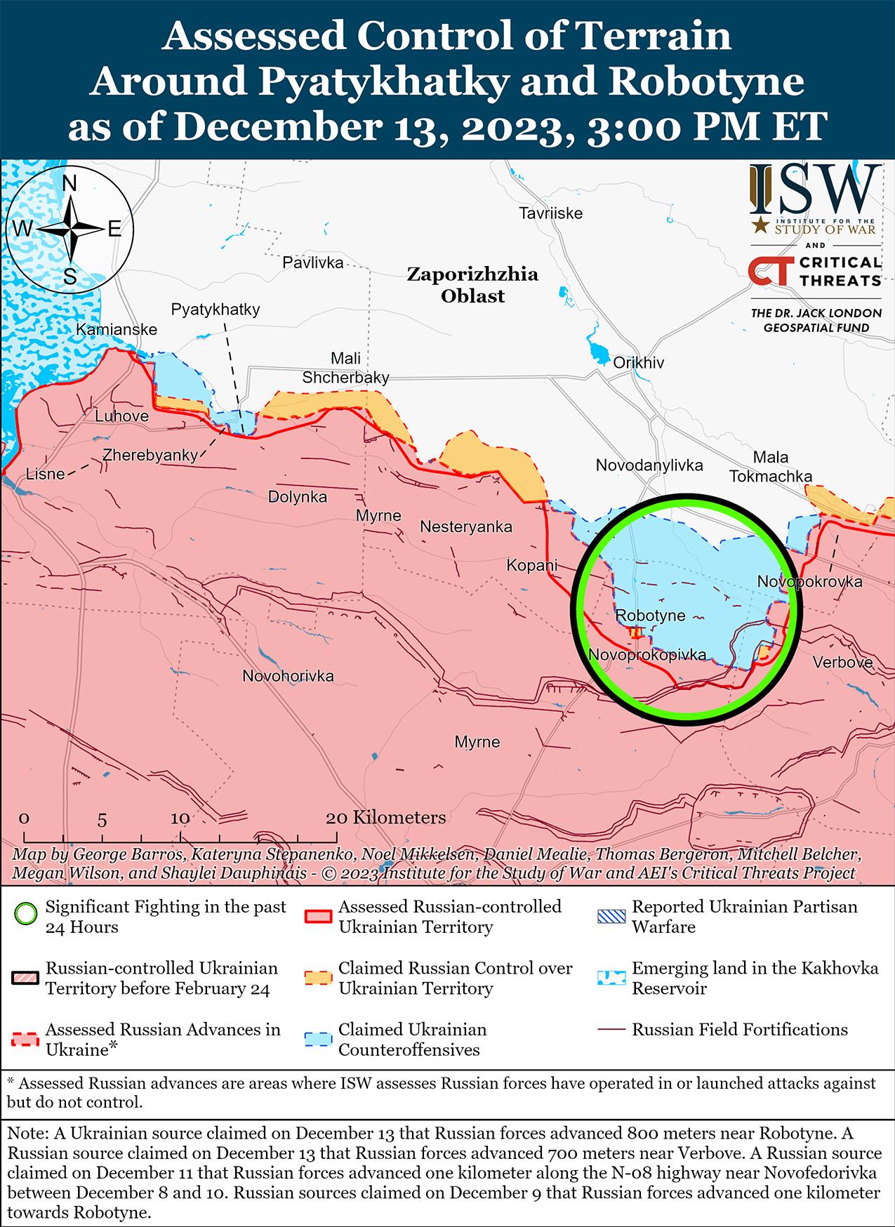 13 декабря украинские силы продолжили наступательные действия в районе населенного пункта Роботино на западе Запорожской области, но не продвинулись вперед. [84] По данным МО РФ, российские войска отразили натиск украинской штурмовой группы к северу от Новопрокоповка (2 км южнее Роботино). [85] Российские военные блогеры утверждали, что украинские войска продолжали наступление к северу от Вербовое (9 км к востоку от Роботино), но отмечали, что интенсивность украинских обстрелов снизилась из-за грязи, льда и снега в этом районе. [86]
