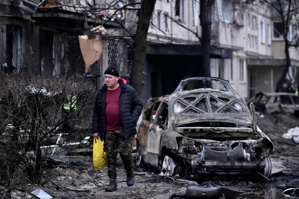 Мужчина проходит мимо разбитых автомобилей рядом с поврежденным жилым домом после ракетного удара в Киеве, 13 декабря 2023 года на фоне вторжения России в Украину | Sergey Chuzavkov/AFP via Getty images