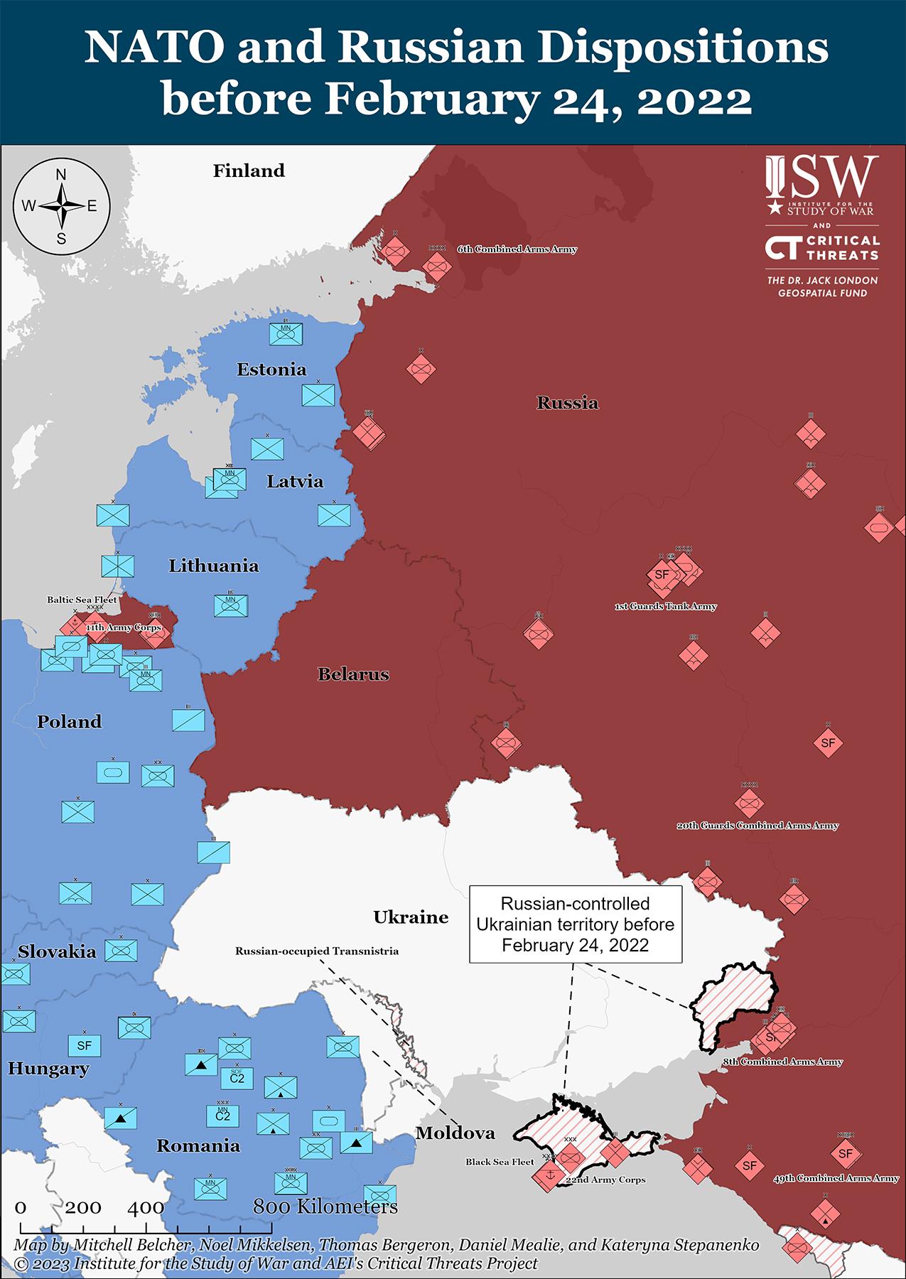 Карта 1, показывающая развертывание России и НАТО до 2022 года, отражает общедоступные отчеты о местонахождении соединений/частей НАТО в эшелоне бригады/полка и выше, а также оценку ISW расположения российских подразделений на этих эшелонах и выше. [12]