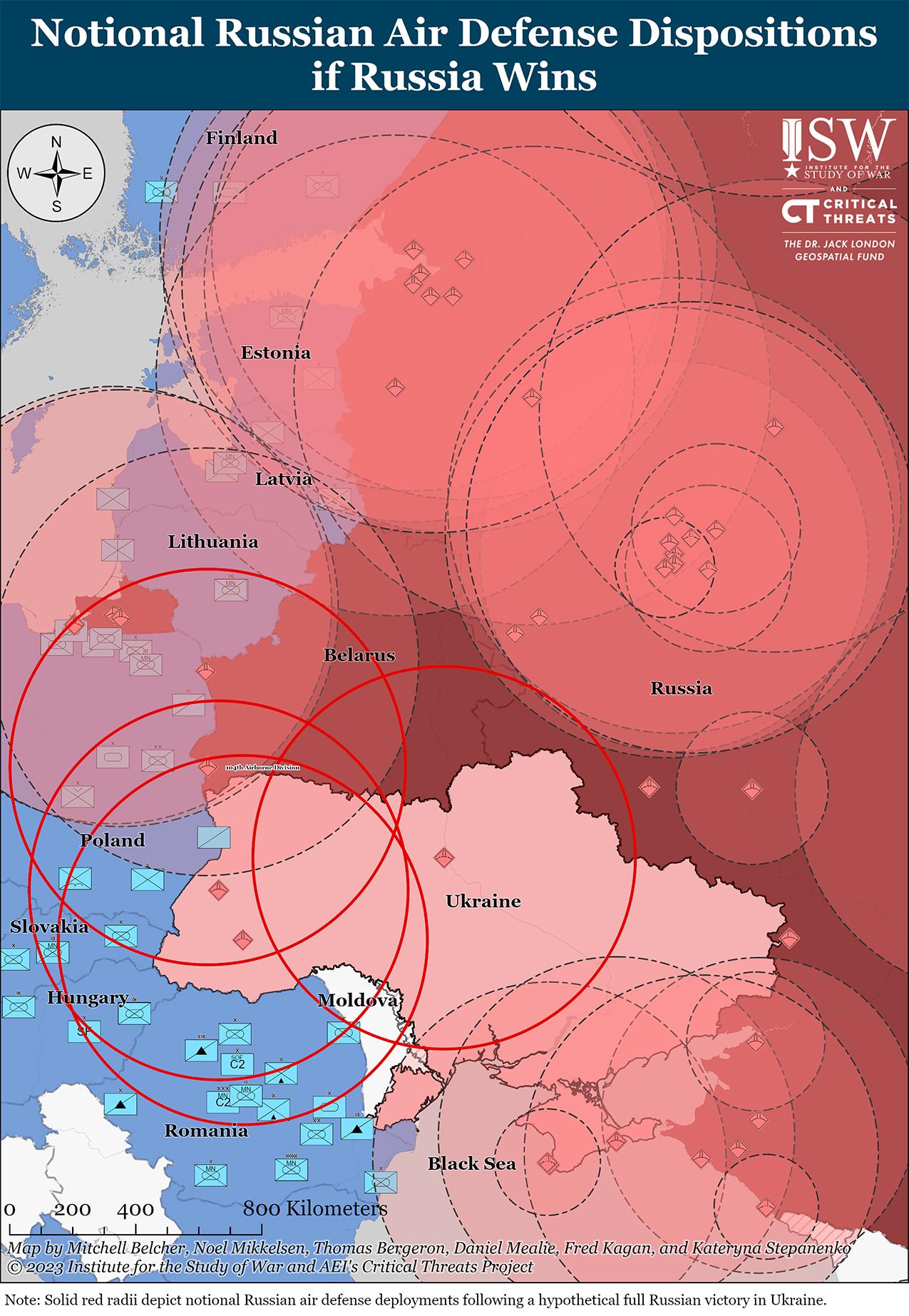 На карте 3 изображен гипотетический набор российских соединений после полного завоевания Россией Украины. В тексте, сопровождающем карту, объясняется, почему мы решили показать на карте количество армий, дивизий и бригад русских, и почему мы выбрали именно эти русские соединения для передвижения. Русские могли бы и почти наверняка сделали бы другие конкретные решения на всех уровнях, включая точное тактическое расположение отдельных полков и бригад. Многие из них мы разместили в местах, ранее использовавшихся Советским Союзом или Украиной; другие — в местах, которые кажутся подходящими в качестве плацдармов для нападения на одну или несколько стран НАТО. Цель иллюстрации — показать консервативную оценку дислокации российских сил, предназначенных для того, чтобы угрожать НАТО реальным вторжением, а не аргументировать необходимость какого-либо конкретного российского набора подразделений или того, что русские будут развертываться именно по такой схеме.