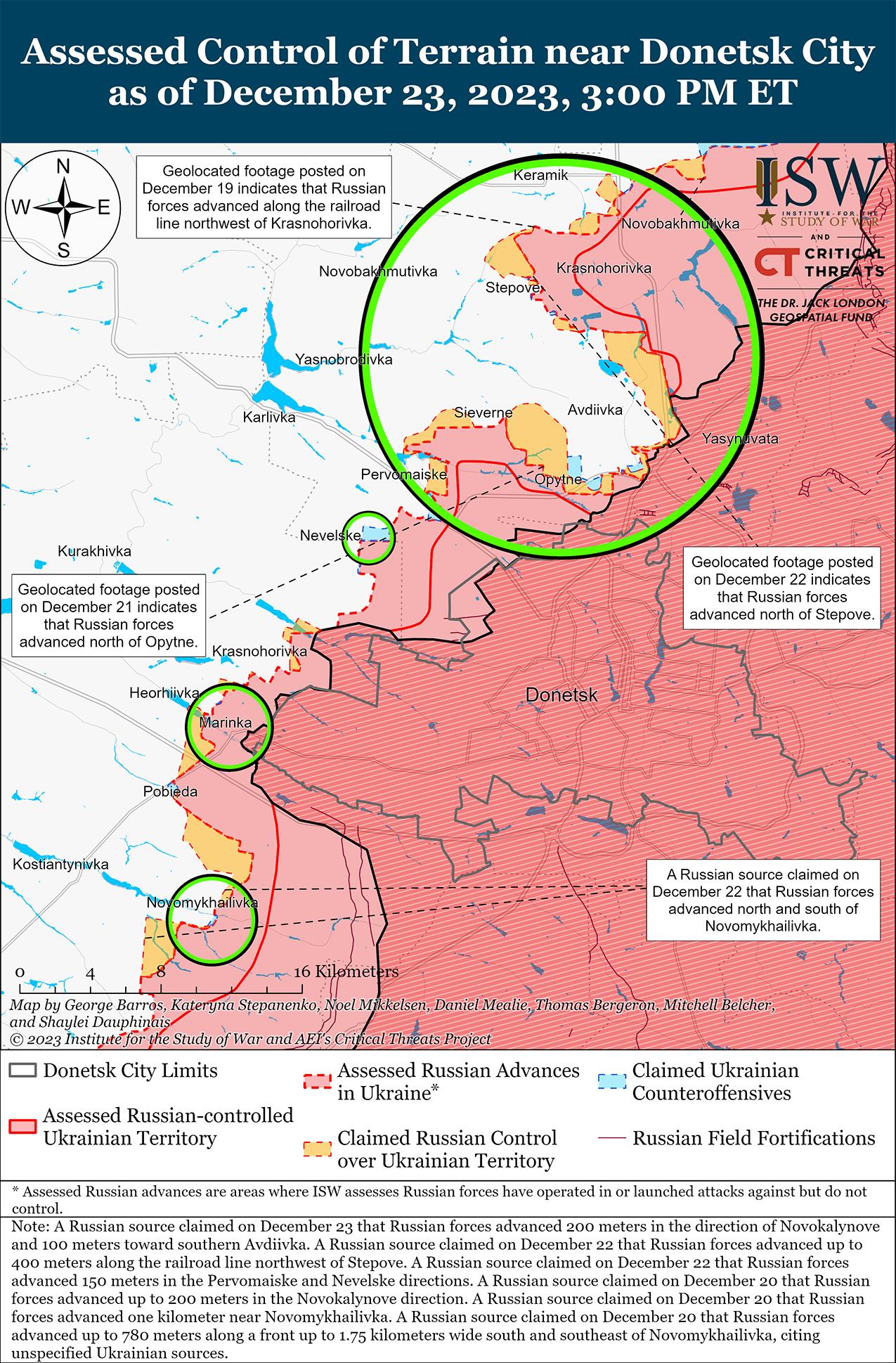 Сообщается, что по состоянию на 23 декабря российские войска продвинулись вблизи Авдеевки, однако подтвержденных изменений линии фронта на этом участке не было. Российские источники утверждали, что российские войска продвинулись к северо-западу от Авдеевки в районе Авдеевского коксохимического завода и в направлении Очеретино; юго-западнее Авдеевки от Водяного и Опытного; и к юго-востоку от Авдеевки от промышленной зоны, хотя ISW не обнаружил визуальных доказательств, подтверждающих эти утверждения. [47] Российский блогер утверждал, что российские войска продвинулись на 200 метров в направлении Новокалиново (северо-запад Авдеевки). [48] Российские и украинские источники утверждали, что позиционные бои происходили северо-западнее Авдеевки в районе Новобахмутовки, Новокалиново и Степово и юго-западнее Авдеевки в районе Северного, Первомайского и Невельского. [49] Сообщается, что подразделения российской 110-й мотострелковой бригады (1-й армейский корпус ДНР) действуют в районе Авдеевки. [50]