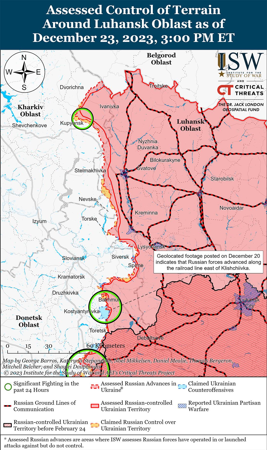 Недавно российские войска подтвердили продвижение в районе Купянска и Кременной. Геолоцированные кадры, опубликованные 23 декабря, свидетельствуют о том, что российские войска добились незначительных успехов на севере Синьковки (северо-восточнее Купянска) и к югу от Дибровой (юго-западнее Кременной). [38] Продолжались позиционные бои на Купянском направлении в районах населенных пунктов Синьковка, Лиманское озеро (северо-западнее Синьковки) и Ивановки, а также западнее Кременной в районах населенных пунктов Житловка, Терны, Торское и Серебрянское лесничество. [39] На Купянском и Кременском направлениях действуют части 6-й и 20-й общевойсковых армий (ОА) соответственно (обе – Западного военного округа). [40]