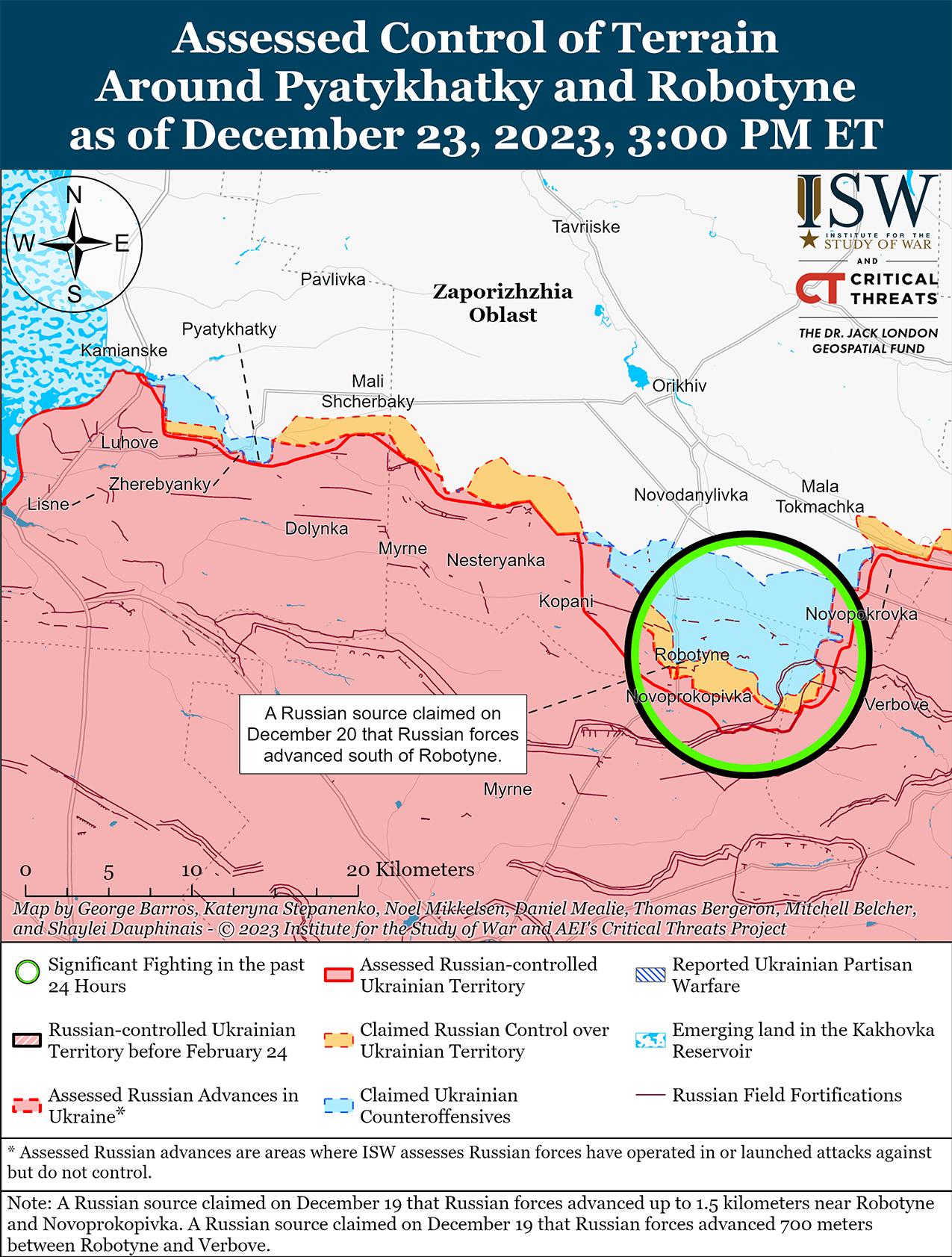 23 декабря российские и украинские войска продолжили позиционные бои в районе Роботино, но подтвержденных изменений на линии фронта не было. Сообщается, что российские войска атаковали вдоль линии Копани-Роботино-Новопрокоповка-Вербовое к югу и востоку от Роботино, а также в районе Новопокровки (северо-восток Роботино). [57] Российский военный блогер также утверждал, что украинские войска атаковали российские позиции вдоль линии Роботино-Вербовое. [58] Оккупационный чиновник Запорожской области Владимир Рогов дополнил кадры, на которых видно, как российский военнослужащий идет по грязной траншее, предполагая, что погодные условия в этом районе по-прежнему осложняют маневр. [59] Сообщается, что подразделения 247-го гвардейского воздушно-десантного полка (7-я гвардейская дивизия ВДВ) продолжают действовать в районе Вербового. [60] Мэр Мелитополя Иван Федоров сообщил, что российские войска продолжают укреплять Токмак, а также северо-запад и юг Мелитополя в оккупированной Запорожской области. [61] Российские источники утверждали, что 22 декабря украинские силы нанесли удар беспилотниками по Бердянску и нанесли удар ракетами HIMARS по зданию администрации Токмака. [62]