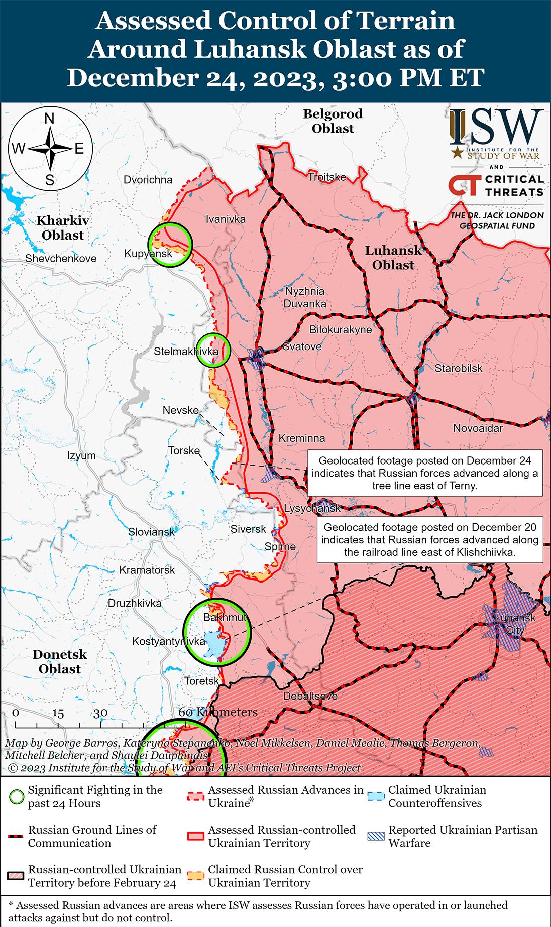 Недавно российские войска подтвердили наступление в районе Кременной. На геолоцированных кадрах, опубликованных 24 декабря, видно, что российские войска недавно продвинулись к востоку от Терны (к западу от Кременной). [41] Российский военный блогер утверждал, что российские войска находятся менее чем в четырех километрах от Терны, хотя геолоцированные кадры показывают, что российские войска находятся чуть более чем в четырех километрах от окраин Терны. [42] Российский военный блогер утверждал, что российские войска незначительно продвинулись на Купянском направлении в районе Синьковки (северо-восточнее Купянска), хотя ISW не обнаружил визуальных доказательств этого утверждения. [43] Российские и украинские источники сообщали, что продолжались позиционные бои на Купянском направлении в районе Синьковки и Стельмаховки (северо-западнее Сватово) и на Лиманском направлении восточнее Ямполовки (северо-западнее Кременной); к югу от Кузьмино (юго-западнее Кременной); вблизи Терны (западнее Кременной), Торского (западнее Кременной), Дибровы и Серебрянского лесного массива (оба юго-западнее Кременной). [44] Украинский Генштаб сообщил, что враг увеличил количество артиллерийских обстрелов на Хортицком направлении (Купянское, Лиманское и Бахмутское направления) до более чем 1 000 обстрелов в сутки. [45] Сообщается, что подразделения российской 7-й мотострелковой бригады (2-й армейский корпус ЛНР) продолжают действовать в районе Белогоровки Луганской области. [46]