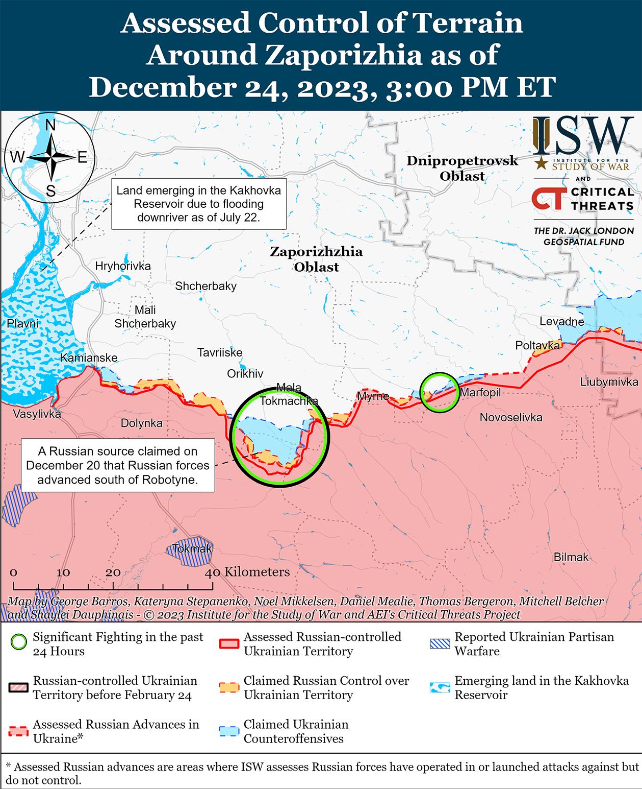 24 декабря украинские и российские войска продолжили позиционные бои на западе Запорожской области, однако подтвержденных изменений на линии фронта не было. Украинские и российские источники сообщили, что позиционные бои происходили в районе Роботино и Вербовое, а также к югу от Гуляйполе (36 км к востоку от Орехова). [60] Российские военные блогеры продолжали отмечать, что плохие погодные условия влияют на способность российских и украинских войск проводить наземные маневры. [61] Российский военный блогер утверждал, что в район Роботино был переброшен плохо подготовленный «спецконтингент» и усилено неназванное российское воздушно-десантное подразделение (ВДВ) – в соответствии с заявлением командующего ВДВ России генерал-полковника Михаила Теплинского от 23 декабря о том, что новые выпускники Рязанского высшего воздушно-десантного командного училища были отправлены в зоны боевых действий раньше предполагаемой даты развертывания. [62] По имеющимся сведениям, подразделения российского 247-го полка ВДВ (7-я дивизия ВДВ) действуют в районе Вербовое. [63]