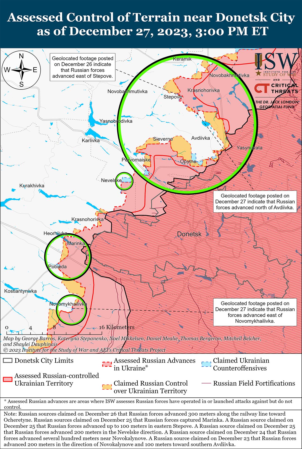 Российские войска, вероятно, продолжали укреплять контроль над Марьинкой (к западу от Донецка) 27 декабря и недавно добились успехов к юго-западу от Донецка. Геолоцированные кадры, опубликованные 27 декабря, свидетельствуют о том, что российские войска недавно продвинулись к востоку от Новомихайловки (к юго-западу от Донецка). [70] Опубликованные 27 декабря кадры с российским военным блогером, свободно гуляющим по Марьинке, также свидетельствуют о том, что российские войска контролируют большую часть, если не всю Марьинку. [71] Российский блогер утверждал, что российские войска продвинулись к юго-востоку от Победы (юго-запад Донецка), хотя ISW не обнаружил визуальных подтверждений этого утверждения. [72] Российские и украинские источники утверждали, что позиционные бои происходили в районе Марьинки, Новомихайловки и Победы. [73] По имеющимся сведениям, в районе Марьинки действуют подразделения 103-го мотострелкового полка (150-я мотострелковая дивизия, 8-я общевойсковая армия, Южный военный округ), а в районе Новомихайловки – подразделения российского 33-го мотострелкового полка (20-я мотострелковая дивизия, 8-я общевойсковая армия). [74]