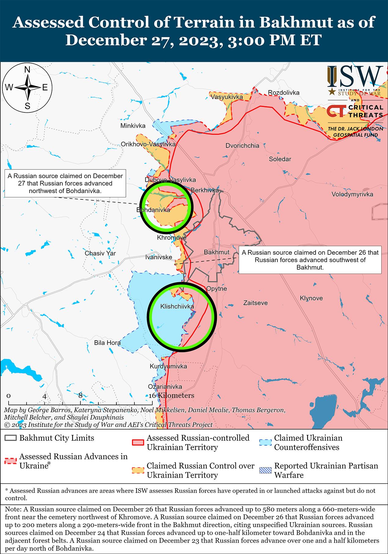 Сообщается, что 27 декабря российские войска продвинулись в районе Бахмута и продолжили позиционные бои с украинскими силами. Известный российский блогер заявил, что российские войска продвинулись на глубину и ширину до 500 метров в лесном массиве к северу от Богдановки (северо-западнее Бахмута), хотя ISW не обнаружил визуального подтверждения этого утверждения. [56] Российские и украинские источники утверждали, что позиционные бои происходили к северо-западу от Бахмута в районе Богдановки, к западу от Бахмута в районе Ивановского и в направлении Часового Яра и к юго-западу от Бахмута в районе Клещеевки и Андреевки. [57] Сырский заявил, что российское командование недавно перебросило с южного направления в район Бахмута неустановленные части Русского добровольческого корпуса и что неустановленный личный состав Каспийской флотилии участвует в наступательных операциях в этом районе. [58] Украинский военный обозреватель Константин Машовец заявил 24 декабря, что российское командование перебрасывает подразделения 177-го полка морской пехоты (Каспийская флотилия) в район Курдюмовки (юго-западнее Бахмута) после вывода этих подразделений из боев в районе Крынки и Подстепного на восточном (левом) берегу Херсонской области для восстановления и пополнения в течение неопределенного периода времени. [59]
