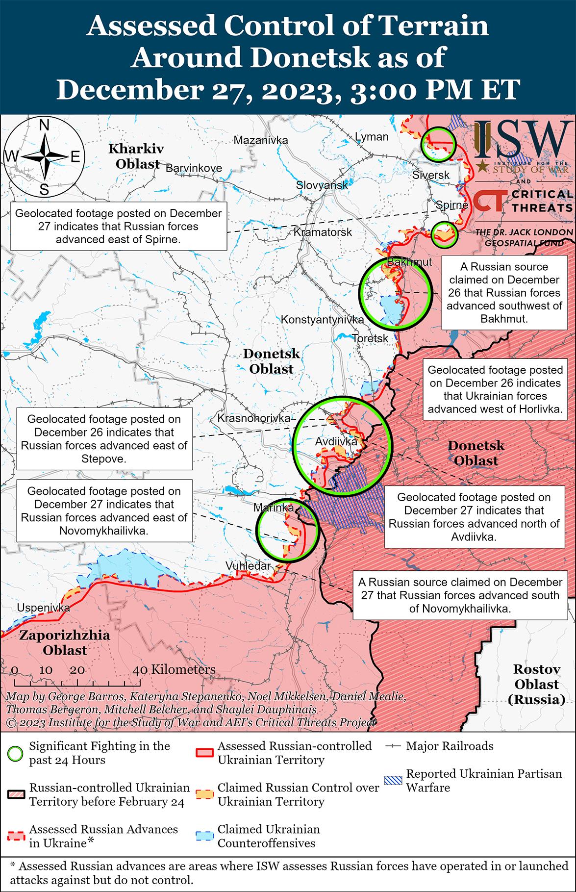 Недавно российские войска продвинулись к северу от Авдеевки и 27 декабря продолжили позиционные бои с украинскими силами. Геолоцированные кадры, опубликованные 26 декабря, свидетельствуют о том, что российские войска недавно продвинулись в восточной части Степного (к северу от Авдеевки). [62] На дополнительных геолоцированных кадрах, опубликованных 27 декабря, видно, что российские войска продвинулись к югу от Авдеевского террикона (к северо-востоку от Авдеевки). [63] Российские и украинские источники утверждали, что позиционные бои продолжались северо-западнее Авдеевки в районах населенных пунктов Очеретино, Новокалиново и Новобахмутовка; севернее Авдеевки в районе Степного; вблизи Авдеевского коксохимического завода на северо-западе Авдеевки; вблизи промзоны к юго-востоку от Авдеевки; и юго-западнее Авдеевки вблизи Водяного, Северного, Первомайского и Невельского. [64] Командующий украинской Таврийской группировкой войск бригадный генерал Александр Тарнавский заявил, что российские войска ведут штурмовые действия при поддержке бронетехники в районе Авдеевки и что за прошедшие сутки украинские силы уничтожили 60% российской бронетехники, участвовавшей в штурмах. [65] Сообщается, что подразделения нерегулярной российской бригады «Пятнашка» участвуют в российских наступательных операциях в районе Авдеевки. [66]