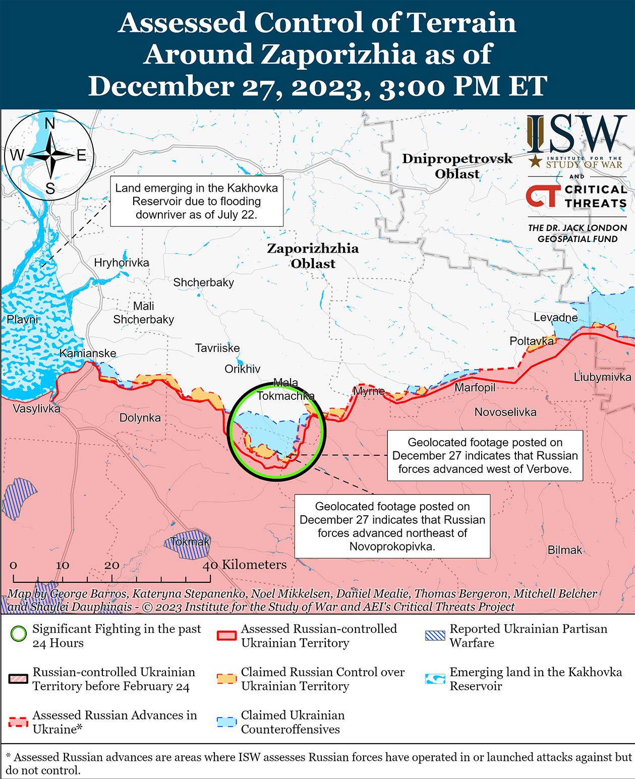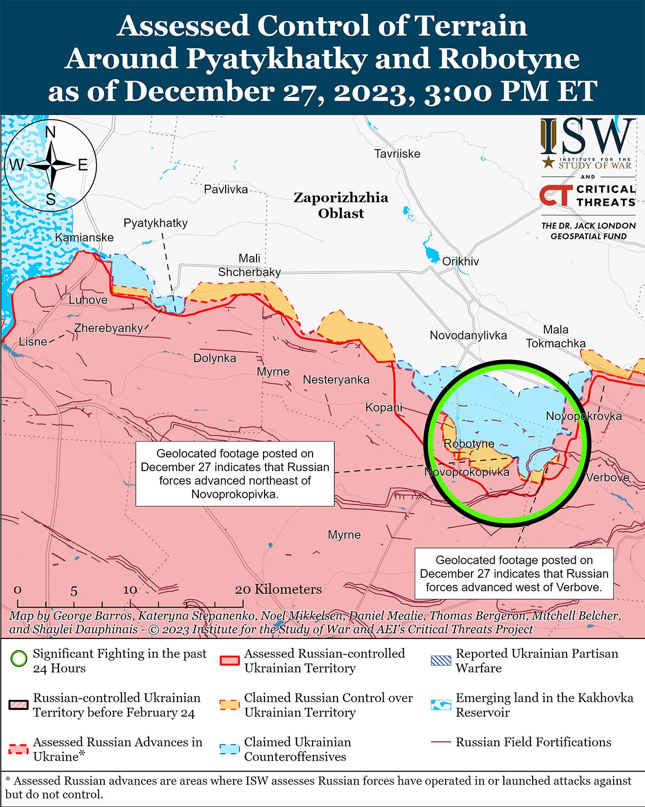Российские войска недавно продвинулись на западе Запорожской области и отбили позиции, которые украинские войска захватили в ходе контрнаступления летом 2023 года, вероятно, после того, как украинские войска отошли на более выгодные оборонительные позиции возле Роботино на зиму. Геолоцированные кадры, опубликованные 14 и 27 декабря, свидетельствуют о том, что российские войска недавно продвинулись к западу от Вербовое (9 км к востоку от Роботино). [7] Командующий украинской Таврийской группировкой войск бригадный генерал Александр Тарнавский в интервью Би-би-си, опубликованном 27 декабря, заявил, что руководство России хочет как минимум вернуть Авдеевку, но имеет более амбициозную цель – захватить всю Донецкую и Луганскую области и вернуть территорию, потерянную российскими войсками в Запорожской области в ходе украинского контрнаступления. [8] По оценкам ISW, захват Украиной близлежащих позиций в августе 2023 года был тактически значимым, поскольку он мог позволить украинским силам начать действовать за пределами самых плотных российских минных полей и последующих российских оборонительных рубежей, но не оценивает, что возврат этих позиций российскими войсками особенно важен в настоящее время. [9] Тем не менее, недавние успехи России в западной части Запорожской области подтверждают мнение ISW о том, что нынешняя позиционная война в Украине не является стабильным тупиком, поскольку текущий баланс может быть смещен в любую сторону решениями, принятыми на Западе или в России, и ограниченные успехи России могут стать значительными, особенно если Запад прекратит военную помощь Украине. [10]