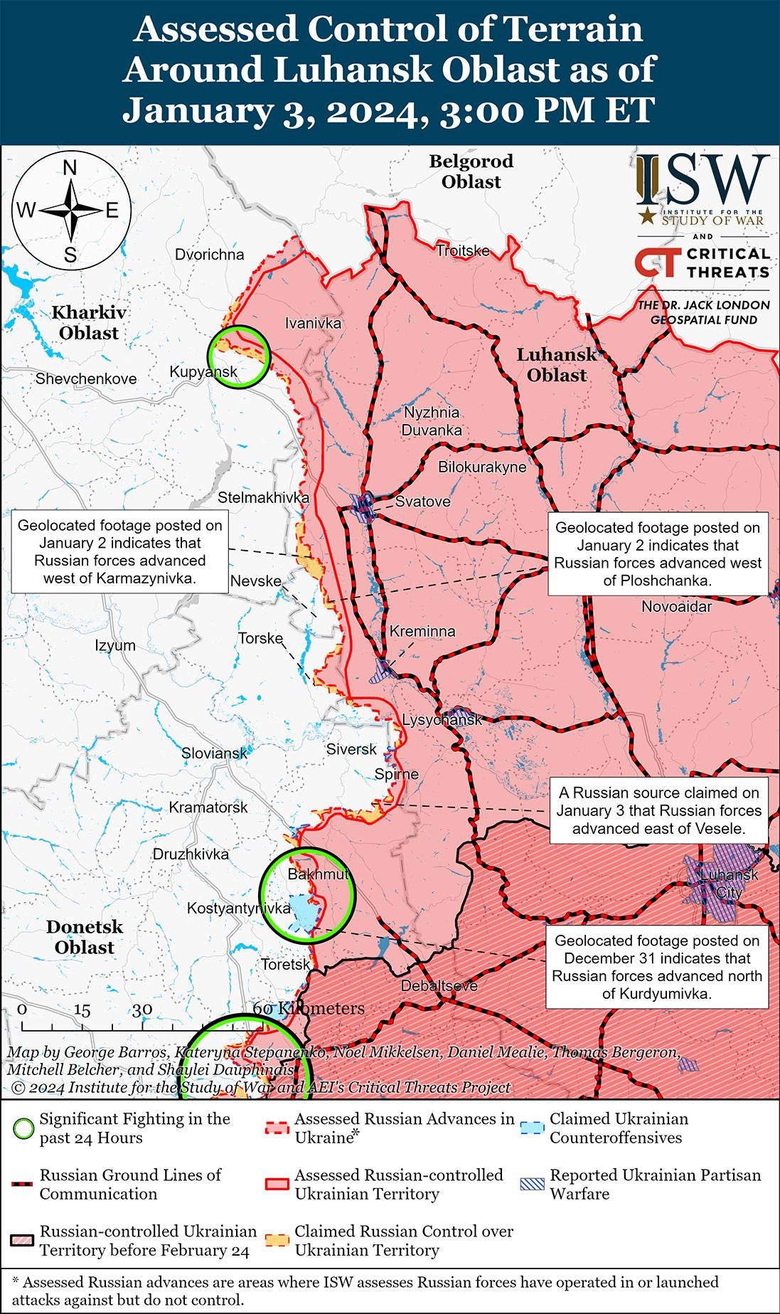 Российский военный блогер заявил, что 3 января российские войска продвинулись к северо-востоку от Бахмута, но подтвержденных изменений линии фронта на этом участке не было. [39] Блогер утверждал, что российские войска возобновили наступление на северо-восточном и восточном флангах Веселое (около 18 км к северо-востоку от Бахмута) и публиковал карту, на которой утверждалось, что российские войска продвинулись в этих районах. [40] ISW пока не обнаружил визуальных подтверждений этих российских продвижений в районе Веселого.