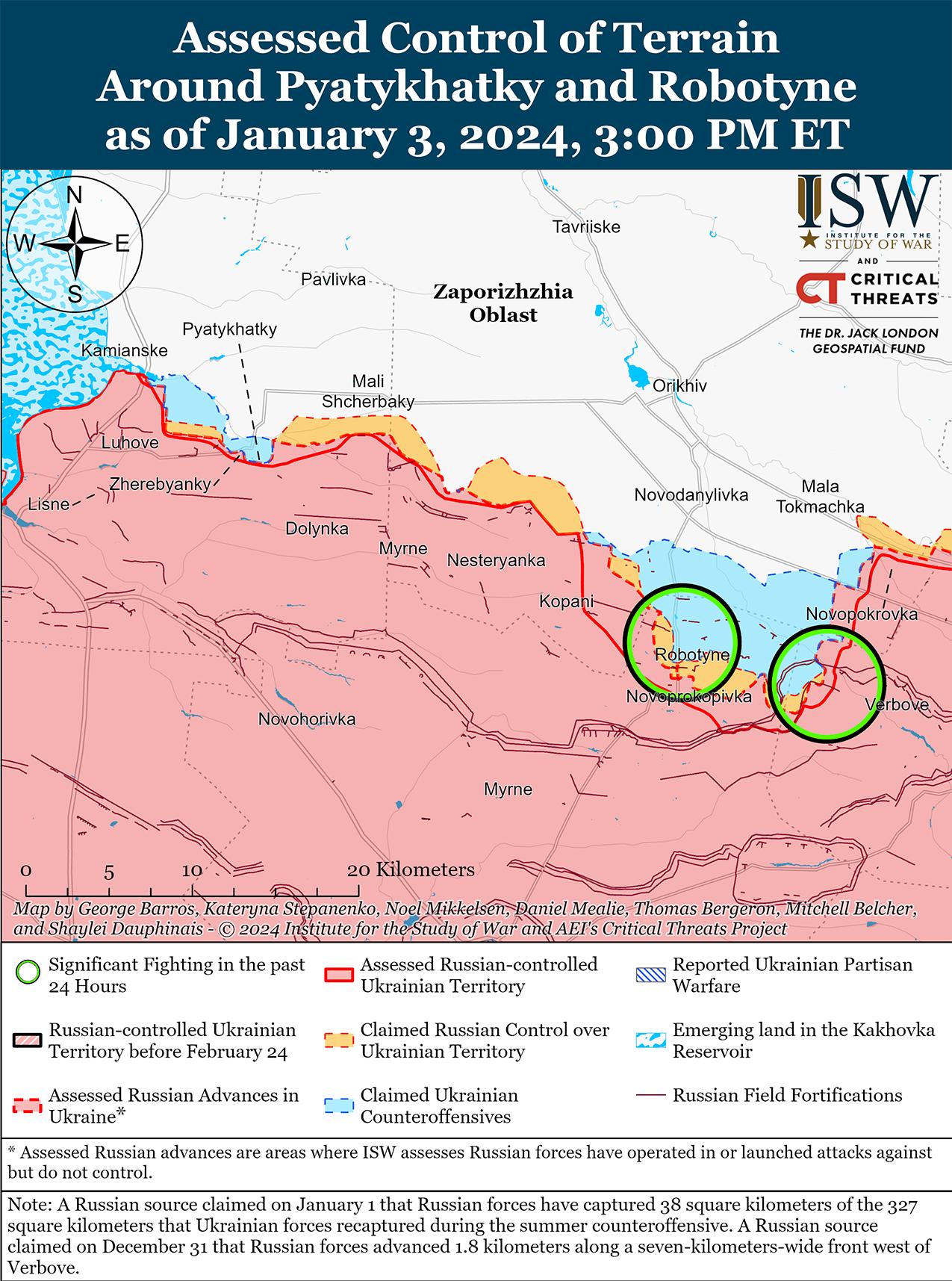 Сообщается, что 3 января украинские силы добились незначительных успехов на западе Запорожской области на фоне продолжающихся позиционных боев в этом районе, хотя ISW не наблюдал каких-либо подтвержденных изменений. Украинский Генштаб сообщил, что украинские силы незначительно продвинулись к востоку от Роботино в районе Вербового. [57] Продолжались позиционные бои в районе Роботино, а также восточнее и южнее Роботино в районе Вербового, Новопрокоповки и Новофедоровки. [58]